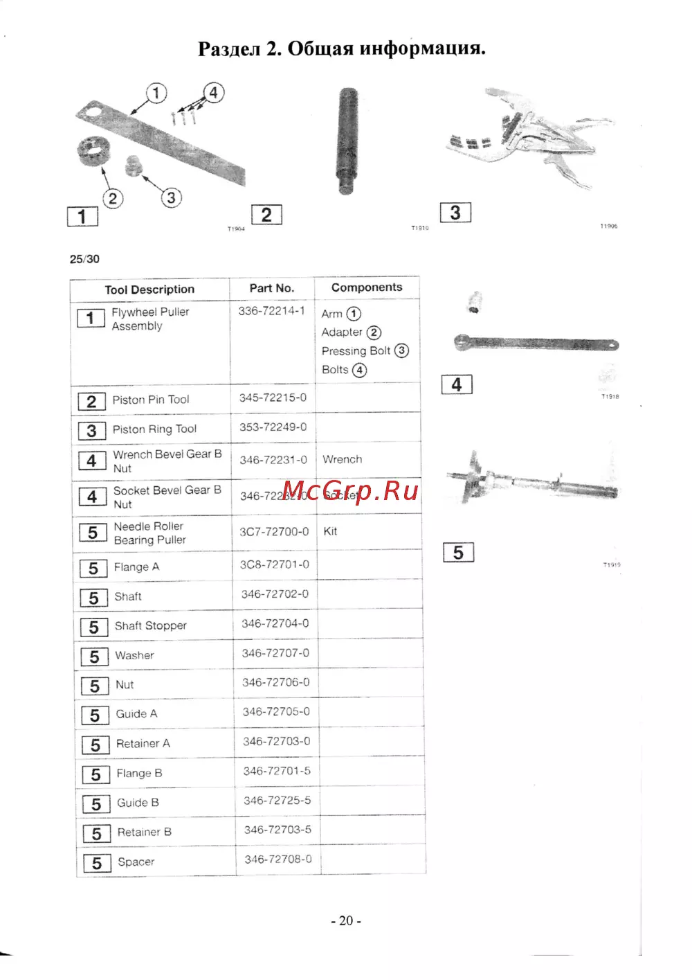 Раздел 2 Общая информация 25 30 Part No Tool Description 336 72214 1 Flywheel Puller Assembly Components Arm 7 Adapter 2 Pressing Bolt Bolts 4 2 Piston Pin Tool 345 72215 0 3 Piston Ring Tool 353 72249 0 Wrench Bevel Gear B uJLJ Nut 346 72231 0 Wrench A Socket Bevel Gear B I LJ Nut 346 72232 0 Socket E Needle Roller L2J Bearing Puller 3C7 72700 0 Kit 5 Flange A 5 Shaft 3C8 72701 0 346 72702 0 1 5 Shaft Stopper 346 72704 0 5 Washer 346 72707 0 5 Nut 346 72706 0 5 Guide A 346 72705 0 5 Retainer A 346 72703 0 5 Flange B 346 72701 5 5 Guide B 346 72725 5 5 Retainer B I 346 72703 5 5 Spacer i 346 72708 0 20
