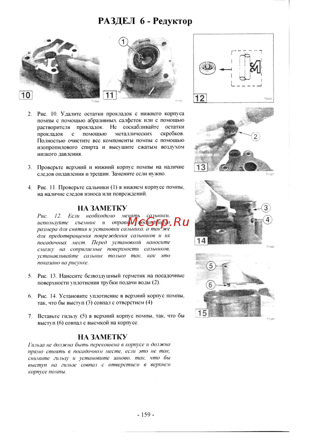 РАЗДЕЛ 6 Редуктор 2 Рис 10 Удалите остатки прокладок с нижнего корпуса помпы с помощью абразивных салфеток или с помощью растворителя прокладок Не соскабливайте остатки прокладок с помощью металлических скребков Полностью очистите все компоненты помпы с помощью изопропилового спирта и высушите сжатым воздухом низкого давления 3 Проверьте верхний и нижний корпус помпы на наличие следов оплавления и трещин Замените если нужно 4 Рис 11 Проверьте сальники 1 в нижнем корпусе помпы на наличие следов износа или повреждений НА ЗАМЕТКУ Рис 12 Если необходимо менять сальники используйте съемник и оправку подходящего размера для снятия и установки сальника а так же для предотвращения повреждения сальников и их посадочных мест Перед установкой наносите смазку на сопрягаемые поверхности сальников устанавливайте сальник только так как это показано на рисунке 5 Рис 13 Нанесите безвоздушный герметик на посадочные поверхности уплотнения трубки подачи воды 2 6 Рис 14 Установите уплотнение в верхний корпус помпы так что бы выступ 3 совпал с отверстием 4 7 Вставьте гильзу 5 в верхний корпус помпы так что бы выступ 6 совпал с выемкой на корпусе НА ЗАМЕТКУ Гильза не должна быть перекошена в корпусе и должна прямо стоять в посадочном месте если это не так снимите гильзу и установите заново так что бы выступ на гильзе совпал с отверстием в верхнем корпусе помпы 159