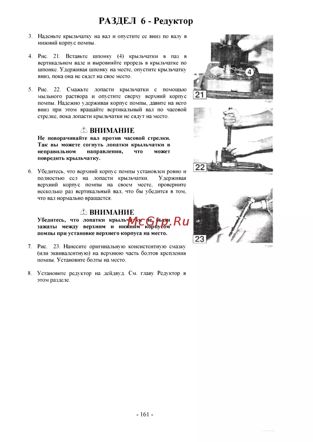 РАЗДЕЛ 6 Редуктор 3 Наденьте крыльчатку на вал и опустите ее вниз по валу в нижний корпус помпы 4 Рис 21 Вставьте шпонку 4 крыльчатки в паз в вертикальном вале и выровняйте прорезь в крыльчатке по шпонке Удерживая шпонку на месте опустите крыльчатку вниз пока она не сядет на свое место 5 Рис 22 Смажьте лопасти крыльчатки с помощью мыльного раствора и опустите сверх верхний корпус помпы Надежно удерживая корте помпы давите на него вниз при этом вращайте вертикальный вал по часовой стрелке пока лопасти крыльчатки нс сядут на место ВНИМАНИЕ Не поворачивайте вал против часовой стрелки Так вы можете согнуть лопатки крыльчатки в неправильном направлении что может повредить крыльчатку 6 Убедитесь что верхний корт е помпы установлен ровно и полностью сел на лопасти крыльчатки Удерживая верхний корте помпы на своем месте проверните несколько раз вертикальный вал что бы убедится в том что вал нормально вращается А ВНИМАНИЕ Убедитесь что лопатки крыльчатки не были зажаты между верхним и нижним корпусом помпы при установке верхнего корпуса на место 7 Рис 23 Нанесите оригинальную консистентную смазку или эквивалентную на верхнюю часть болтов крепления помпы Установите болты на место 8 Установите редуктор на дейдвуд См глав Редуктор в этом разделе 161 71358