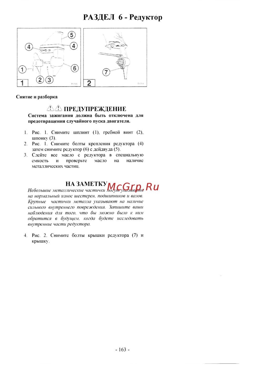 РАЗДЕЛ 6 Редуктор Снятие и разборка ПРЕДУПРЕЖДЕНИЕ Система зажигания должна быть отключена для предотвращения случайного пуска двигателя 1 Рис 1 Снимите шплинт 1 гребной винт 2 шпонку 3 2 Рис 1 Снимите болты крепления редуктора 4 затем снимите редуктор 6 с дейдвуда 5 3 Слейте все масло с редуктора в специальную емкость и проверьте масло на наличие металлических частиц НА ЗАМЕТКУ Небольшие металлические частички могут указывать на нормальный износ шестерен подшипников и валов Крупные частички металла указывают на наличие сильного внутреннего повреждения Запишите ваши наблюдения для того что бы можно было к ним обратится в будущем когда будете исследовать внутренние части редуктора 4 Рис 2 Снимите болты крышки редуктора 7 и крышку 163