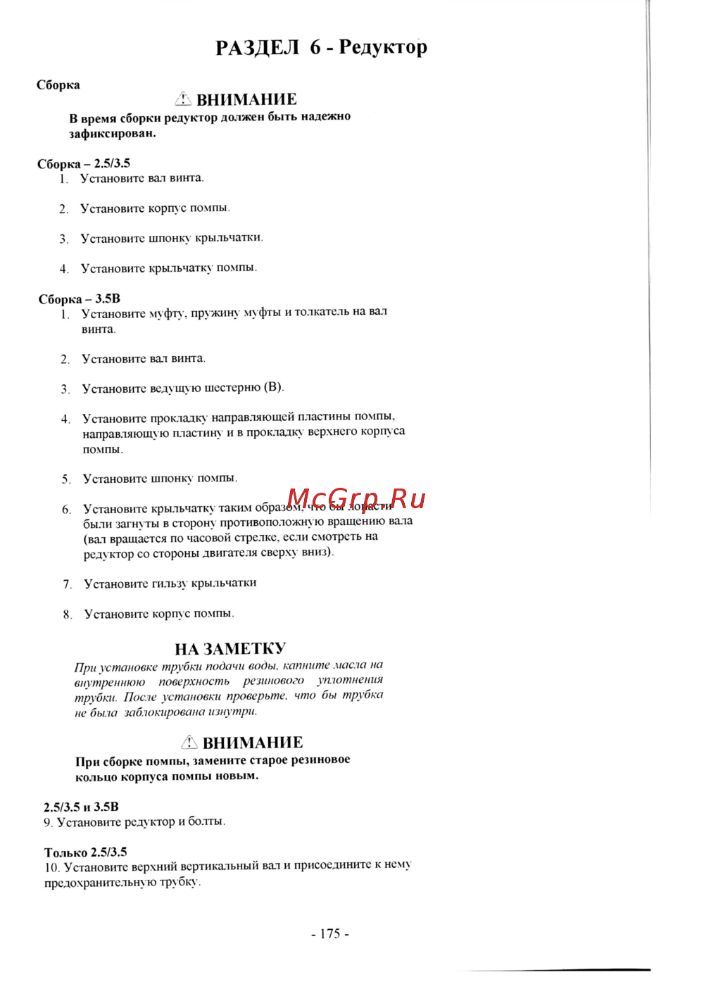 РАЗДЕЛ 6 Редуктор Сборка А ВНИМАНИЕ В время сборки редуктор должен быть надежно зафиксирован Сборка 2 5 3 5 1 Установите вал винта 2 Установите корпус помпы 3 Установите шпонку крыльчатки 4 Установите крыльчатку помпы Сборка 3 5В 1 Установите муфту пружину му фты и толкатель на вал винта 2 Установите вал винта 3 Установите ведущую шестерню В 4 Установите прокладку направляющей пластины помпы направляющую пластину и в прокладку верхнего корпу са помпы 5 Установите шпонку помпы 6 Установите крыльчатку таким образом что бы лопасти были загнуты в сторону противоположную вращению вала вал вращается по часовой стрелке если смотреть на редуктор со стороны двигателя сверху вниз 7 Установите гильзу крыльчатки 8 Установите корпус помпы НА ЗАМЕТКУ При установке трубки подачи воды капните масла на внутреннюю поверхность резинового уплотнения трубки После установки проверьте что бы трубка не была заблокирована изнутри АВНИМАНИЕ При сборке помпы замените старое резиновое кольцо корпуса помпы новым 2 5 3 5 и 3 5В 9 Установите реду ктор и болты Только 2 5 3 5 10 Установите верхний вертикальный вал и присоедините к нему предохранительну ю трубку 175