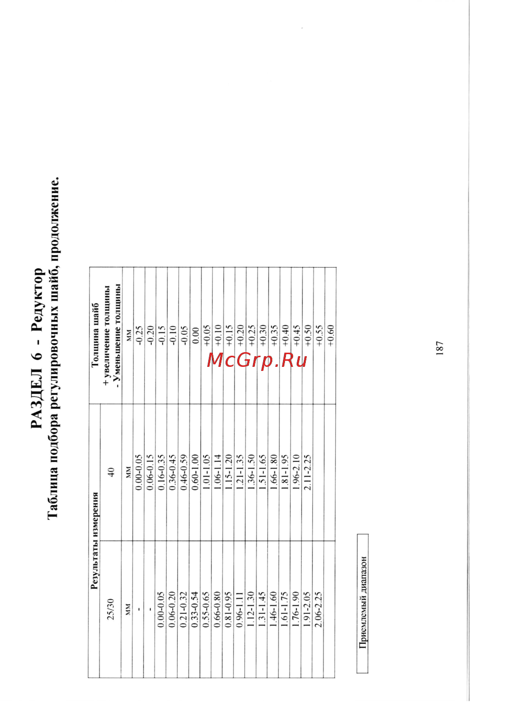 РАЗДЕЛ 6 Редуктор Таблица подбора регулировочных шайб продолжение Результаты измерения 25 30 40 мм 0 00 0 05 0 06 0 20 0 21 0 32 0 33 0 54 0 55 0 65 0 66 0 80 0 81 0 95 0 96 1 11 1 12 1 30 1 31 1 45 1 46 1 60 1 61 1 75 1 76 1 90 1 91 2 05 2 06 2 25 мм 0 00 0 05 0 06 0 15 0 16 0 35 0 36 0 45 0 46 0 59 0 60 1 00 1 01 1 05 1 06 1 14 1 15 1 20 1 21 1 35 1 36 1 50 1 51 1 65 1 66 1 80 1 81 1 95 1 96 2 10 2 11 2 25 Толщина шайб увеличение толщины Уменьшение толщины мм 0 25 0 20 0 15 0 10 0 05 0 00 0 05 0 10 0 15 0 20 0 25 0 30 0 35 0 40 0 45 0 50 0 55 0 60 Приемлемый диапазон 187