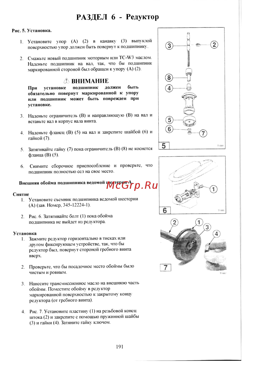 РАЗДЕЛ 6 Редуктор Рис 5 Установка 1 Установите упор А 2 в канавку 3 выпуклой поверхностью упор должен быть повернут к подшипнику 2 Смажьте новый подшипник моторным или ТС З маслом Наденьте подшипник на вал так что бы подшипник маркированной стороной был обращен к упору А 2 А ВНИМАНИЕ При установке подшипник должен быть обязательно повернут маркированной к упору или подшипник может быть поврежден при установке 3 Наденьте ограничитель В и направляющую В на вал и вставьте вал в корпус вала винта 4 Наденьте фланец В 5 на вал и закрепите шайбой 6 и гайкой 7 5 Затягивайте гайку 7 пока ограничитель В 8 не коснется фланца В 5 6 Снимите сборочное приспособление и проверьте что подшипник полностью сел на свое место Внешняя обойма подшипника ведомой шестерни А Снятие 1 Установите съемник подшипника ведомой шестерни А зав Номер 345 12224 1 2 Рис 6 Затягивайте болт 1 пока обойма подшипника не выйдет из редуктора Установка 1 Зажмите редуктор горизонтально в тисках или другом фиксирующем устройстве так что бы редуктор был повернут стороной гребного винта вверх 2 Проверьте что бы посадочное место обоймы было чистым и ровным 3 Нанесите трансмиссионное масло на внешнюю часть обоймы Поместите обоймх в редуктор маркированной поверхностью к закрытому КОНЦУ редуктора от гребного винта 4 Рис 7 Установите пластину 1 на резьбовой конец штока 2 и закрепите с помощью пру жинной шайбы 3 и гайки 4 Затяните гайку ключом 191