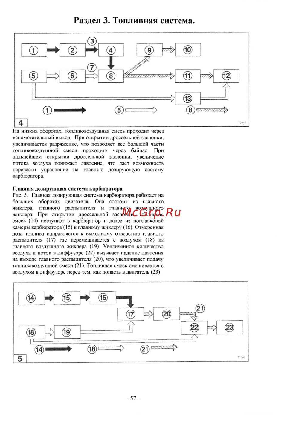 Раздел 3 Топливная система На низких оборотах топливовоздушная смесь проходит через вспомогательный выход При открытии дроссельной заслонки увеличивается разряжение что позволяет все большей части топливовоздушной смеси проходить через байпас При дальнейшем открытии дроссельной заслонки увеличение потока воздуха понижает давление что дает возможность перевести управление на главную дозирующую систему карбюратора Главная дозирующая система карбюратора Рис 5 Главная дозирующая система карбюратора работает на больших оборотах двигателя Она состоит из главного жиклера главного распылителя и главного воздушного жиклера При открытии дроссельной заслонки топливная смесь 14 поступает в карбюратор и далее из поплавковой камеры карбюратора 15 к главному жиклеру 16 Отмеренная доза топлива направляется к выходному отверстию главного распылителя 17 где перемешивается с воздухом 18 из главного воздушного жиклера 19 Увеличенное количество воздуха и поток в диффузоре 22 вызывает падение давления на выходе главного распылителя 20 что увеличивает подачу топливовоздушной смеси 21 Топливная смесь смешивается с воздухом в диффузоре перед тем как попасть в двигатель 23 57
