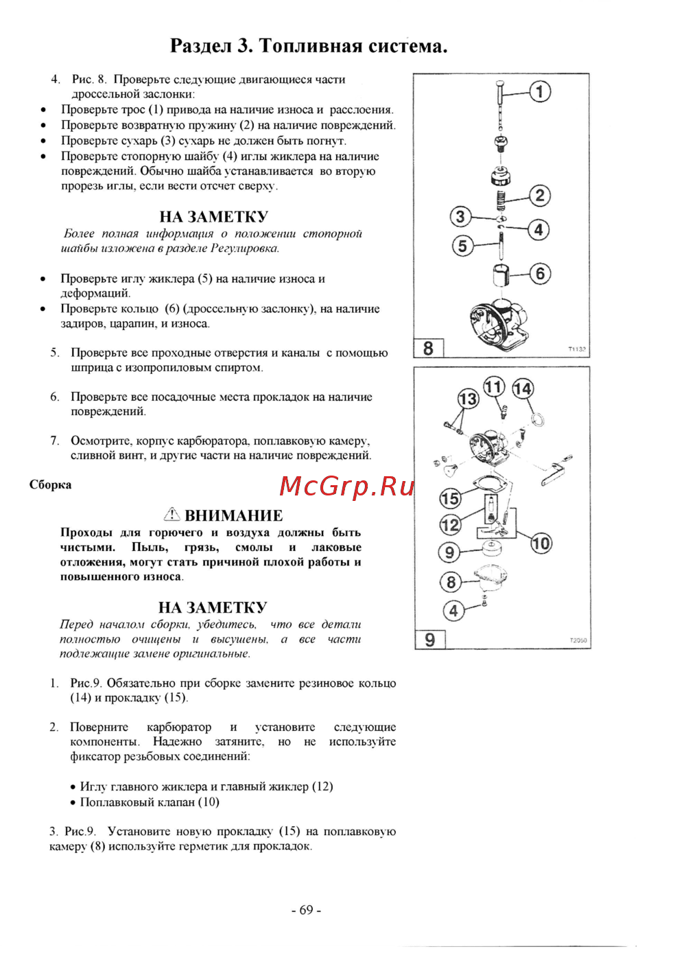 Раздел 3 Топливная система 4 Рис 8 Проверьте следующие двигающиеся части дроссельной заслонки Проверьте трос 1 привода на наличие износа и расслоения Проверьте возвратную пружину 2 на наличие повреждений Проверьте сухарь 3 сухарь не должен быть погнут Проверьте стопорную шайбу 4 иглы жиклера на наличие повреждений Обычно шайба устанавливается во вторую прорезь иглы если вести отсчет сверху НА ЗАМЕТКУ Более полная информация о положении стопорного шайбы изложена е разделе Регулировка Проверьте иглу жиклера 5 на наличие износа и деформаций Проверьте кольцо 6 дроссельную заслонку на наличие задиров царапин и износа 5 Проверьте все проходные отверстия и каналы с помощью шприца с изопропиловым спиртом 6 Проверьте все посадочные места прокладок на наличие повреждений 7 Осмотрите корпус карбюратора поплавковую камеру сливной винт и другие части на наличие повреждений Сборка А ВНИМАНИЕ Проходы для горючего и воздуха должны быть чистыми Пыль грязь смолы и лаковые отложения могут стать причиной плохой работы и повышенного износа НА ЗАМЕТКУ Перед началом сборки убедитесь что все детали полностью очищены и высушены а все части подлежащие замене оригинальные 1 Рис 9 Обязательно при сборке замените резиновое кольцо 14 и прокладку 15 2 Поверните карбюратор и установите следующие компоненты Надежно затяните но не используйте фиксатор резьбовых соединений Иглу главного жиклера и главный жиклер 12 Поплавковый клапан 10 3 Рис 9 Установите новую прокладку 15 на поплавковую камеру 8 используйте герметик для прокладок 69