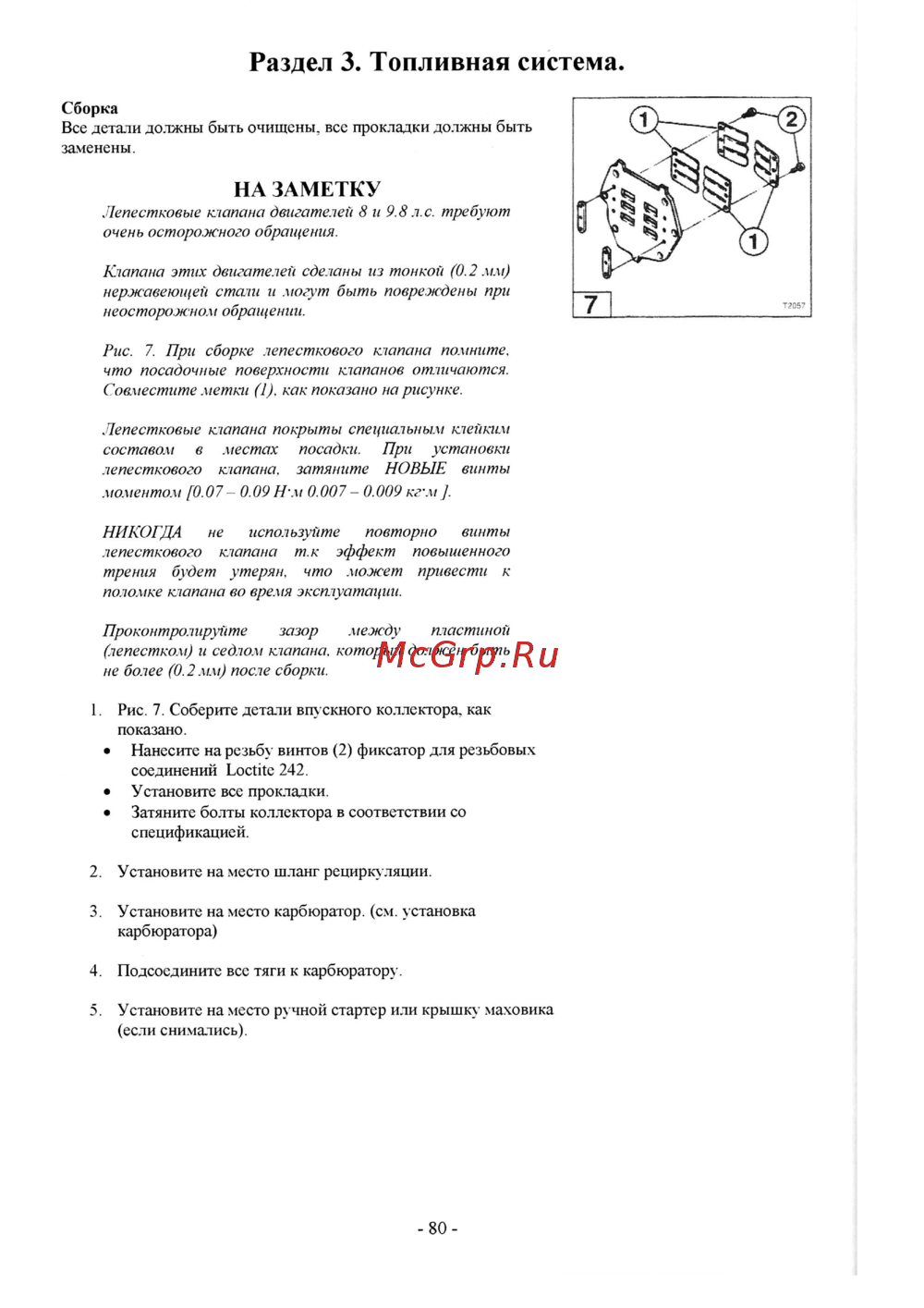 Раздел 3 Топливная система Сборка Все детали должны быть очищены все прокладки должны быть заменены НА ЗАМЕТКУ Лепестковые клапана двигателей 8 и 9 8 л с требуют очень осторожного обращения Клапана этих двигателей сделаны из тонкой 0 2 мм нержавеющей стат и могут быть повреждены при неосторожном обращении Рис 7 При сборке лепесткового клапана помните что посадочные поверхности кчапанов отличаются Совместите метки 1 как показано на рисунке Лепестковые кчапана покрыты специальным клейким составом в местах посадки При установки лепесткового кчапана затяните НОВЫЕ винты моментом 0 07 0 09 Н м 0 007 0 009 кг м НИКОГДА не используйте повторно винты лепесткового кчапана т к эффект повышенного трения будет утерян что может привести к поломке кчапана во время эксплуатации Проконтролируйте зазор между пластиной лепестком и седлом кчапана который должен быть не более 0 2 мм после сборки 1 Рис 7 Соберите детали впускного коллектора как показано Нанесите на резьбу винтов 2 фиксатор для резьбовых соединений Loctite 242 Установите все прокладки Затяните болты коллектора в соответствии со спецификацией 2 Установите на место шланг рециркуляции 3 Установите на место карбюратор см установка карбюратора 4 Подсоедините все тяги к карбюратору 5 Установите на место ру чной стартер или крышку маховика если снимались 80