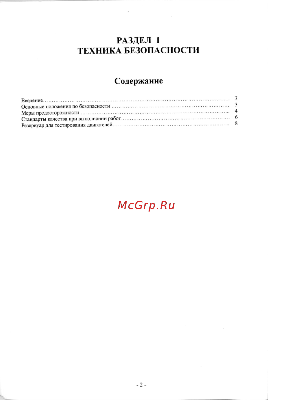 РАЗДЕЛ 1 ТЕХНИКА БЕЗОПАСНОСТИ Содержание Введение Основные положения по безопасности Меры предосторожности Стандарты качества при выполнении работ Резервуар для тестирования двигателей 2