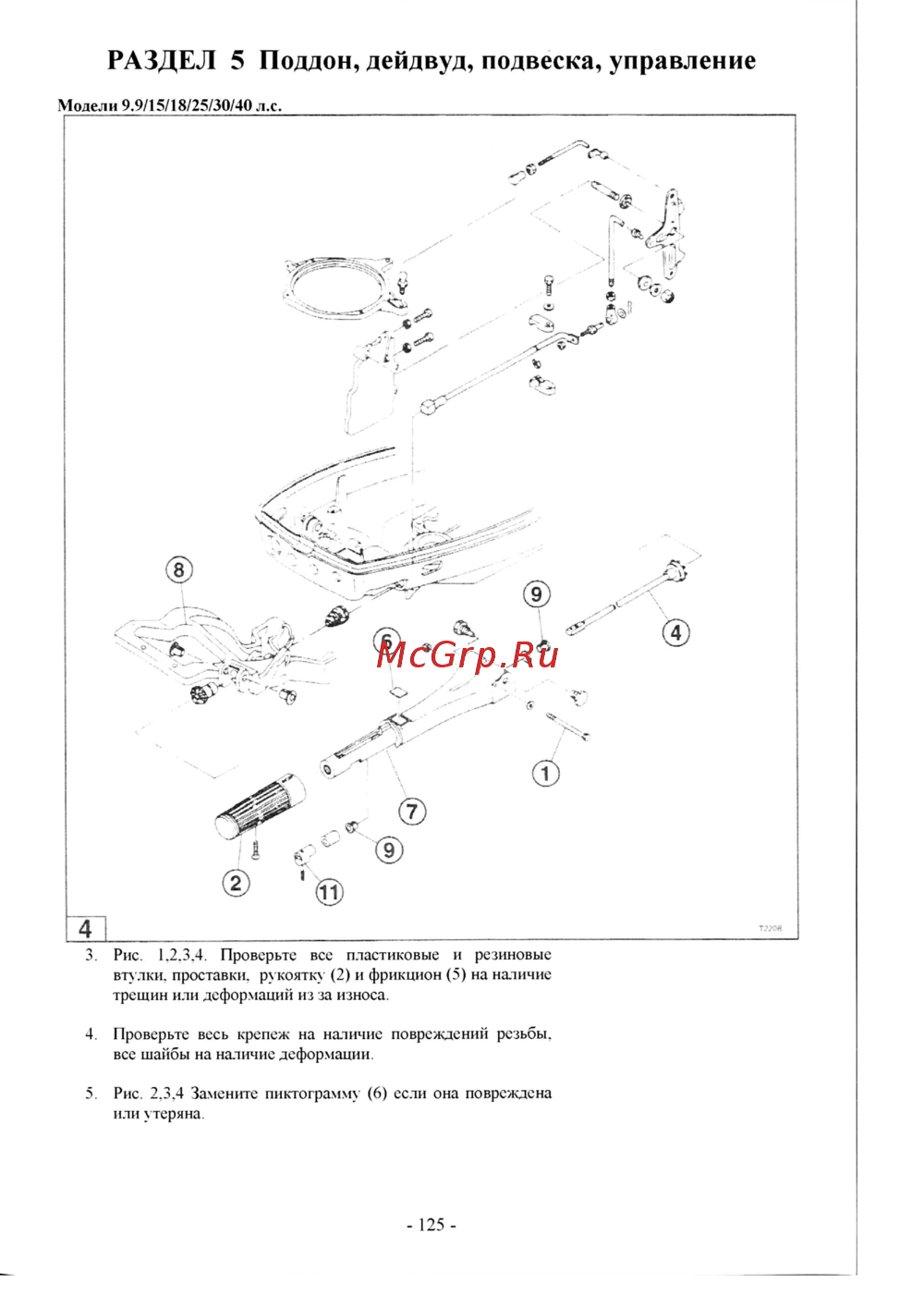 РАЗДЕЛ 5 Поддон дейдвуд подвеска управление Модели 9 9 15 18 25 30 40 л с 3 Рис 1 2 3 4 Проверьте все пластиковые и резиновые втулки проставки рукоятку 2 и фрикцион 5 на наличие трещин или деформаций из за износа 4 Проверьте весь крепеж на наличие повреждений резьбы все шайбы на наличие деформации 5 Рис 2 3 4 Замените пиктограмму 6 если она повреждена или утеряна 125