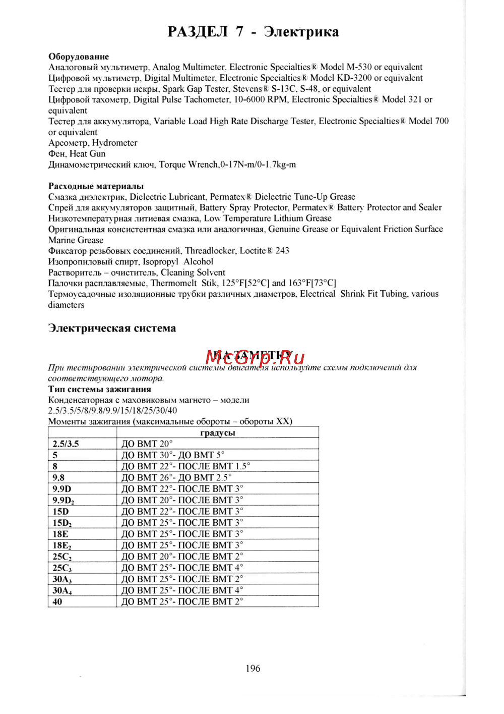 РАЗДЕЛ 7 Электрика Оборудование Аналоговый мультиметр Analog Multimeter Electronic Specialties R Model M 530 or equivalent Цифровой мультиметр Digital Multimeter Electronic Specialties В Model KD 3200 or equivalent Тестер для проверки искры Spark Gap Tester Stevens R S 13C S 48 or equivalent Цифровой тахометр Digital Pulse Tachometer 10 6000 RPM Electronic Specialties R Model 321 or equivalent Тестер для аккумулятора Variable Load High Rate Discharge Tester Electronic Specialties R Model 700 or equivalent Ареометр Hydrometer Фен Heat Gun Динамометрический ключ Torque Wrench 0 17N m 0 1 7kg m Расходные материалы Смазка диэлектрик Dielectric Lubricant Pennatex R Dielectric Tune Up Grease Спрей для аккумуляторов защитный Batten Spray Protector PermatcxR Batten Protector and Sealer Низкотемпературная литиевая смазка Low Temperature Lithium Grease Оригинальная консистентная смазка или аналогичная Genuine Grease or Equivalent Friction Surface Marine Grease Фиксатор резьбовых соединений Thrcadlockcr Loctite R 243 Изопропиловый спирт Isopropyl Alcohol Растворитель очиститель Cleaning Solvent Палочки расплавляемые Thermomelt Stik 125 F 52 C and 163 F 73 C Термоусадочные изоляционные трубки различных диаметров Electrical Shrink Fit Tubing various diameters Электрическая система НА ЗАМЕТКУ При тестировании электрической системы двигателя используйте схемы подключений для соответствующего мотора Тип системы зажигания Конденсаторная с маховиковым магнето модели 2 5 3 5 5 8 9 8 9 9 15 18 25 30 40 Моменты зажигания максимальные обороты обороты XX _____ градусы ДО ВМТ 20 2 5 3 5 5 ДО ВМТ 30 ДО ВМТ 5 8 ДО ВМТ 22 ПОСЛЕ ВМТ 1 5 9 8 ДО ВМТ 26 ДО ВМТ 2 5 9 9D ДО ВМТ 22 ПОСЛЕ ВМТ 3 ДО ВМТ 20 ПОСЛЕ ВМТ 3 9 9D2 15D ДО ВМТ 22 ПОСЛЕ ВМТ 3 ДО ВМТ 25 ПОСЛЕ ВМТ 3 15D2 ДО ВМТ 25 ПОСЛЕ ВМТ 3 18Е 18Е2 ДО ВМТ 25 ПОСЛЕ ВМТ 3 ДО ВМТ 20 ПОСЛЕ ВМТ 2 25С2 ДО ВМТ 25 ПОСЛЕ ВМТ 4 25С3 ДО ВМТ 25 ПОСЛЕ ВМТ 2 ЗОАз ДО ВМТ 25 ПОСЛЕ ВМТ 4 30А4 40 ДО ВМТ 25 ПОСЛЕ ВМТ 2 196