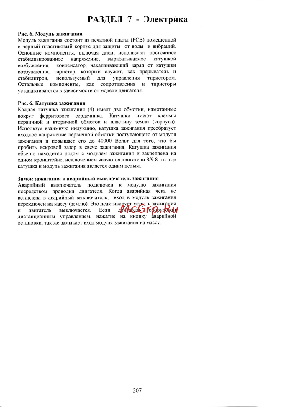 РАЗДЕЛ 7 Электрика Рис 6 Модуль зажигания Модуль зажигания состоит из печатной платы РСВ помещенной в черный пластиковый корпус для защиты от воды и вибраций Основные компоненты включая диод используют постоянное стабилизированное напряжение вырабатываемое катушкой возбуждения конденсатор накапливающий заряд от катушки возбуждения тиристор который служит как прерыватель и стабилитрон используемый для управления тиристором Остальные компоненты как сопротивления и тиристоры устанавливаются в зависимости от модели двигателя Рис 6 Катушка зажигания Каждая катушка зажигания 4 имеет две обмотки намотанные вокруг ферритового сердечника Катушки имеют клеммы первичной и вторичной обмоток и пластину земли корпуса Используя взаимную индукцию катушка зажигания преобразует входное напряжение первичной обмотки поступающего от модуля зажигания и повышает его до 40000 Вольт для того что бы пробить искровой зазор в свече зажигания Катушка зажигания обычно находится рядом с модулем зажигания и закреплена на одном кронштейне исключением являются двигатели 8 9 8 л с где кату шка и модуль зажигания является одним целым Замок зажигания и аварийный выключатель зажигания Аварийный выключатель подключен к модулю зажигания посредством проводки двигателя Когда аварийная чека не вставлена в аварийный выключатель вход в модуль зажигания переключен на массу землю Это деактивирует модуль зажигания и двигатель выключается Если двигатель оборудован дистанционным управлением нажатие на кнопку аварийной остановки так же замыкает вход модуля зажигания на массу 207