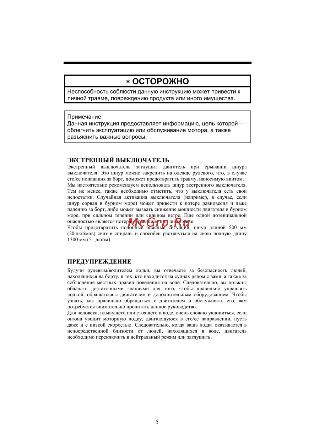- В случае контакта человека с движущейся лодкой картером винтом или любым устройством прочно закрепленным на корпусе лодки или картере существует вероятность получения им серьезной травмы p.6