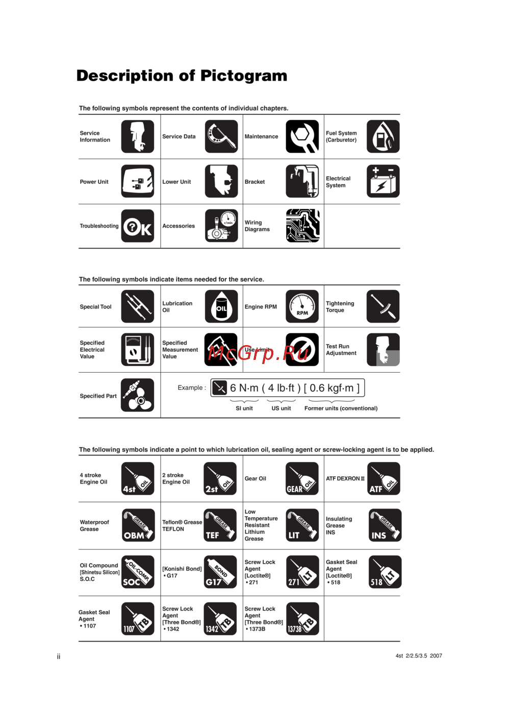 The following symbols indicate a point to which lubrication oil, sealing agent or screw-locking agent is to be applied.