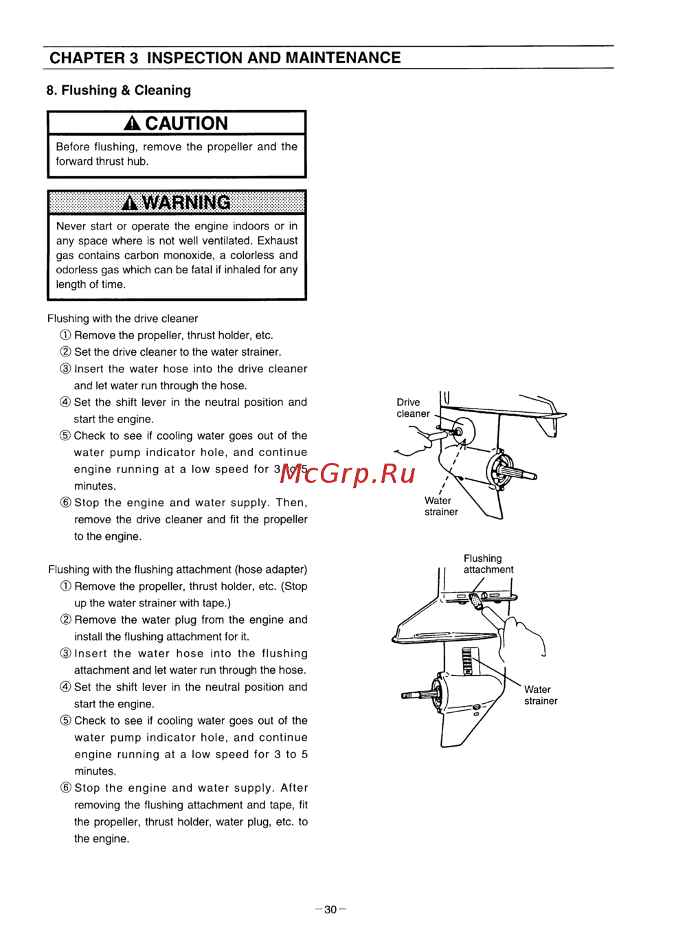 CHAPTER 3 INSPECTION AND MAINTENANCE 8 Flushing Cleaning A CAUTION Before flushing remove the propeller and the forward thrust hub Never start or operate the engine indoors or in any space where is not well ventilated Exhaust gas contains carbon monoxide a colorless and odorless gas which can be fatal if inhaled for any length of time Flushing with the drive cleaner Remove the propeller thrust holder etc Set the drive cleaner to the water strainer Insert the water hose into the drive cleaner and let water run through the hose Set the shift lever in the neutral position and start the engine Check to see if cooling water goes out of the water pump indicator hole and continue engine running at a low speed for 3 to 5 minutes Stop the engine and water supply Then remove the drive cleaner and fit the propeller to the engine Flushing Flushing with the flushing attachment hose adapter Remove the propeller thrust holder etc Stop up the water strainer with tape Remove the water plug from the engine and install the flushing attachment for it Insert the water hose into the flushing attachment and let water run through the hose Set the shift lever in the neutral position and start the engine Check to see if cooling water goes out of the water pump indicator hole and continue engine running at a low speed for 3 to 5 minutes Stop the engine and water supply After removing the flushing attachment and tape fit the propeller thrust holder water plug etc to the engine 30