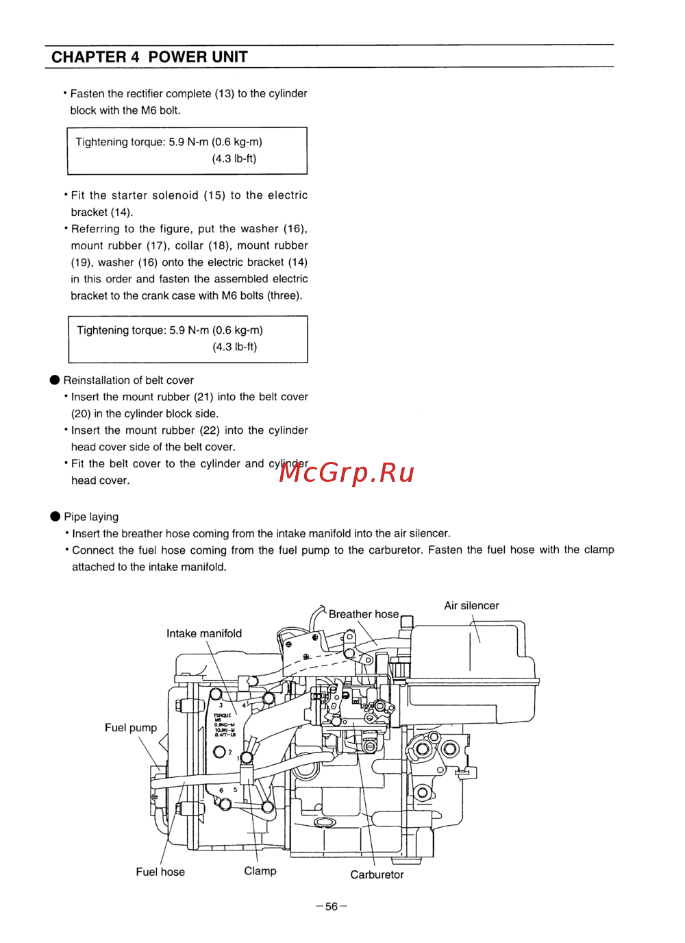 CHAPTER 4 POWER UNIT Fasten the rectifier complete 13 to the cylinder block with the M6 bolt Tightening torque 5 9 N m 0 6 kg m 4 3 Ib ft Fit the starter solenoid 15 to the electric bracket 14 Referring to the figure put the washer 16 mount rubber 17 collar 18 mount rubber 19 washer 16 onto the electric bracket 14 in this order and fasten the assembled electric bracket to the crank case with M6 bolts three Tightening torque 5 9 N m 0 6 kg m 4 3 Ib ft Reinstallation of belt cover Insert the mount rubber 21 into the belt cover 20 in the cylinder block side Insert the mount rubber 22 into the cylinder head cover side of the belt cover Fit the belt cover to the cylinder and cylinder head cover Pipe laying Insert the breather hose coming from the intake manifold into the air silencer Connect the fuel hose coming from the fuel pump to the carburetor Fasten the fuel hose with the clamp attached to the intake manifold 56