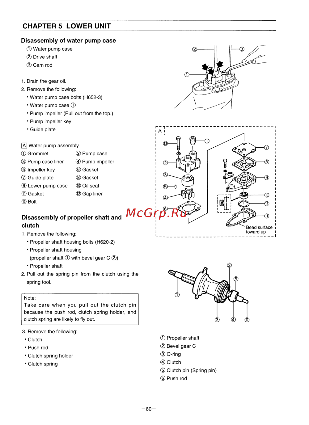 CHAPTERS LOWER UNIT Disassembly of water pump case Water pump case Drive shaft Cam rod 1 Drain the gear oil 2 Remove the following Water pump case bolts H652 3 Water pump case Pump impeller Pull out from the top Pump impeller key Guide plate A Water pump assembly Grommet Pump case Pump case liner Pump impeller Impeller key Gasket Guide plate Gasket Lower pump case Oil seal Gasket Gap liner Bolt Disassembly of propeller shaft and clutch 1 Remove the following Propeller shaft housing bolts H620 2 Propeller shaft housing propeller shaft with bevel gear C Propeller shaft 2 Pull out the spring pin from the clutch using the spring tool Note Take care when you pull out the clutch pin because the push rod clutch spring holder and clutch spring are likely to fly out 3 Remove the following Clutch Propeller shaft Push rod Bevel gear C Clutch spring holder O ring Clutch spring Clutch Clutch pin Spring pin Push rod 60
