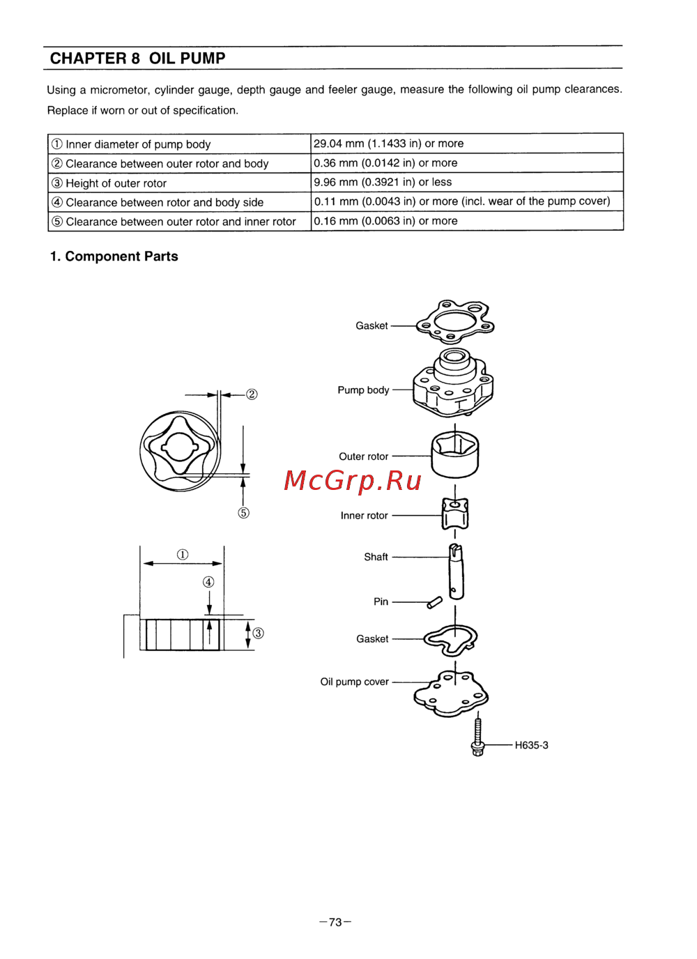 CHAPTER 8 OIL PUMP Using a micrometer cylinder gauge depth gauge and feeler gauge measure the following oil pump clearances Replace if worn or out of specification Inner diameter of pump body 29 04 mm 1 1433 in or more Clearance between outer rotor and body 0 36 mm 0 0142 in or more Height of outer rotor 9 96 mm 0 3921 in or less Clearance between rotor and body side 0 11 mm 0 0043 in or more incl wear of the pump cover Clearance between outer rotor and inner rotor 0 16 mm 0 0063 in or more 1 Component Parts Gasket __ S Pump body o S Tj Hh Outer rotor Inner rotor Shaft Pin T Gasket Oil pump cover 7o l A lb H635 3 73