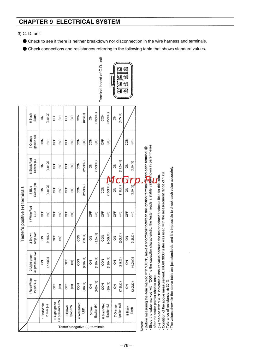 Tester s negative terminals œ I 2 Light green 3 Brown 4 White Red 5 Blue 6 Black Red 7 Orange 8 Black Pulser Oil pressure SW Stop SW LED Exciter H Exciter L Ignition coil Earth 1 Red White ON ON OFF ON ON CON ON Pulser 7 5k Q 17kQ co 7 8k Q 7 8kQ 3 0kQ 2 Light green OFF OFF OFF OFF OFF OFF OFF Oil pressure SW oo oo oo oo oo oo oo 3 Brown OFF OFF OFF OFF OFF OFF OFF Stop SW oo oo oo oo co oo oo 4 White Red CON CON CON CON CON CON 250k Q oo 85kQ ON CON ON 130kQ oo 100kQ CON OFF CON 130kQ oo 550k Q CON LED 90kQ 220k Q 1MQ 5 Blue ON ON ON Exciter H 6 Black Red Exciter L I 1 Red White 100kQ CON 60k Q 250k Q OFF 130kQ 3 5kQ oo CON CON OFF 130kQ 400k Q co 7 Orange ON ON ON OFF ON ON Ignition coil 7 5k Q 11kQ 30k Q oo 11kQ 11 5kQ 8 Black ON ON ON OFF ON ON CON Earth 3 0k Q 4 0k Q 12kQ oo 4 0k Q 4 0k Q oo Notes Before measuring the item marked with CON make a shortcircuit between the ignition terminal and earth terminal Since the value marked with CON is the capacitor characteristic the tester reads a stable value shown in parentheses after the tester pointer shakes once oo marked with CON indicates a minute value because the tester pointer shakes a little for this item Condition of the above measurement HIOKI 3030 tester was used with the measurement range of 1 kQ Tolerance of resistance 20 The values shown in the above table are just standards and it is impossible to check each value accurately ON 3 7k Q Terminal board of C D unit CHAPTER 9 ELECTRICAL SYSTEM Tester s positive terminals