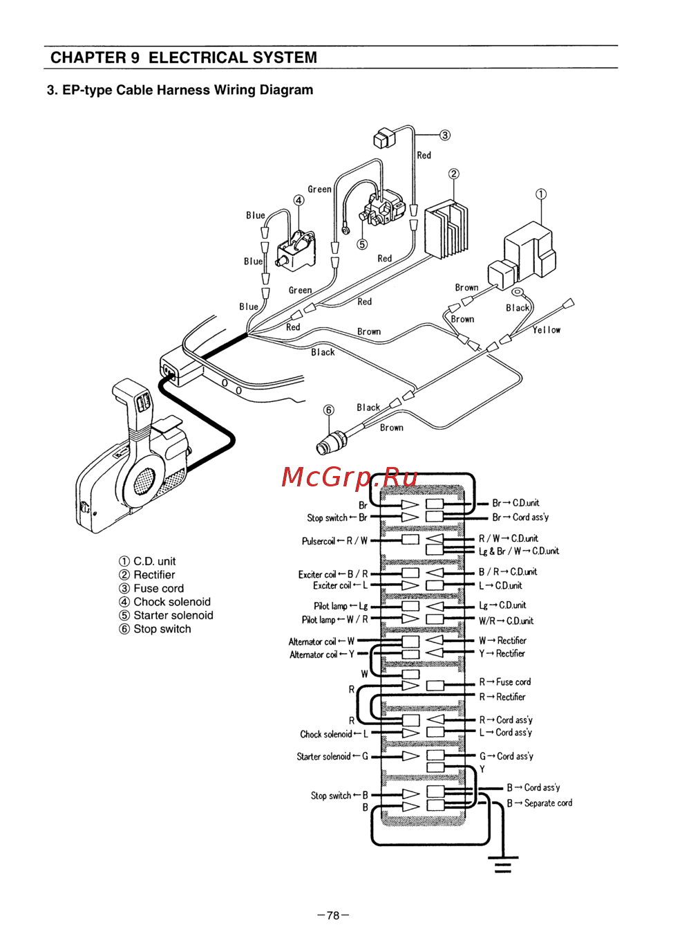 CHAPTER 9 ELECTRICAL SYSTEM 3 EP type Cable Harness Wiring Diagram Green Blue Blue Brown Green Red Blue Black Brown el low Brown Black Black Brown Br Br CD unit Stop switch Br BrCord assy R W CD unit Pulsercoil R W Lg Br WCD unit ф C D unit 2 Rectifier Fuse cord Chock solenoid Starter solenoid Stop switch Exciter coil B R Exciter coil L В R CD unit L CD unit Pilot lamp Lg Lg C D unit Pilot lamp W R W R CD unit Alternator coil W W Rectifier Alternator coil Y Y Rectifier R Fuse cord R Rectifier R Cord assy Chock solenoid L L Cord assy Starter solenoid G G Cord assy В Cord assy Stop switch В В 78 В Separate cord