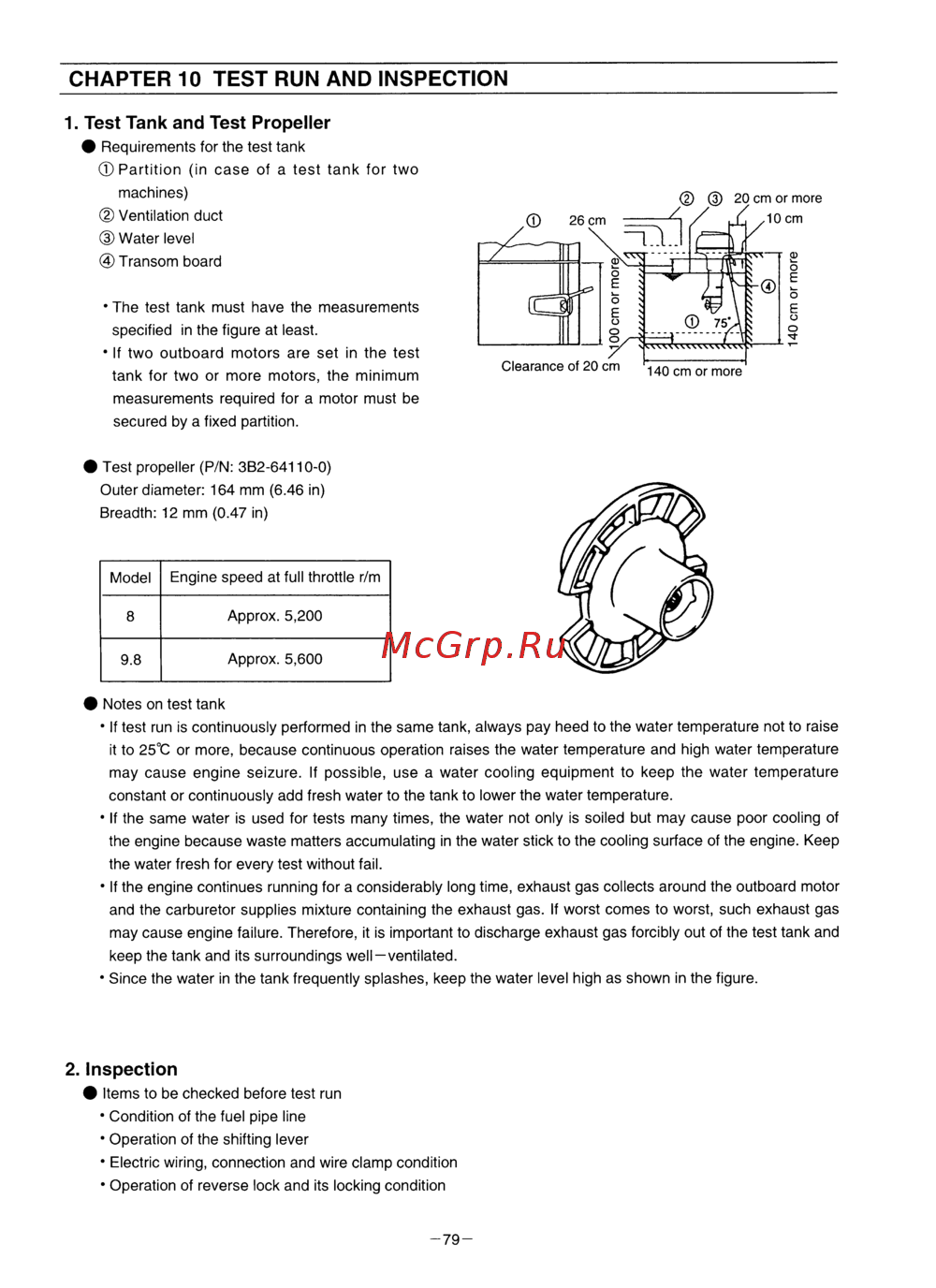 CHAPTER 10 TEST RUN AND INSPECTION 1 Test Tank and Test Propeller Requirements for the test tank Partition in case of a test tank for two machines Ventilation duct Water level Transom board The test tank must have the measurements specified in the figure at least If two outboard motors are set in the test Clearance of 20 cm tank for two or more motors the minimum 140 cm or more measurements required for a motor must be secured by a fixed partition Test propeller P N 3B2 64110 0 Outer diameter 164 mm 6 46 in Breadth 12 mm 0 47 in Model Engine speed at full throttle r m 8 Approx 5 200 9 8 Approx 5 600 Notes on test tank If test run is continuously performed in the same tank always pay heed to the water temperature not to raise it to 25 C or more because continuous operation raises the water temperature and high water temperature may cause engine seizure If possible use a water cooling equipment to keep the water temperature constant or continuously add fresh water to the tank to lower the water temperature If the same water is used for tests many times the water not only is soiled but may cause poor cooling of the engine because waste matters accumulating in the water stick to the cooling surface of the engine Keep the water fresh for every test without fail If the engine continues running for a considerably long time exhaust gas collects around the outboard motor and the carburetor supplies mixture containing the exhaust gas If worst comes to worst such exhaust gas may cause engine failure Therefore it is important to discharge exhaust gas forcibly out of the test tank and keep the tank and its surroundings well ventilated Since the water in the tank frequently splashes keep the water level high as shown in the figure 2 Inspection Items to be checked before test run Condition of the fuel pipe line Operation of the shifting lever Electric wiring connection and wire clamp condition Operation of reverse lock and its locking condition 79
