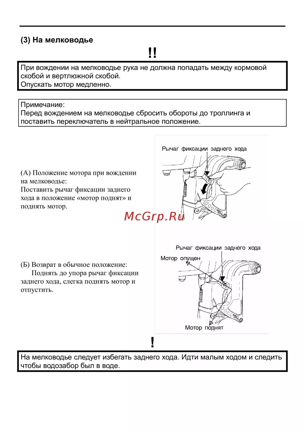 Перед вождением на мелководье сбросить обороты до троллинга и