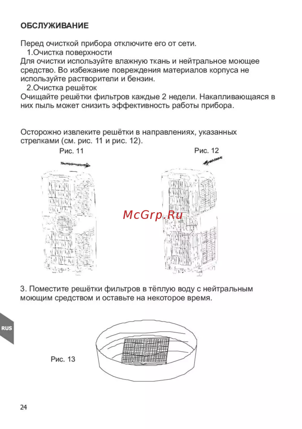 ОБСЛУЖИВАНИЕ Перед очисткой прибора отключите его от сети 1 Очистка поверхности Для очистки используйте влажную ткань и нейтральное моющее средство Во избежание повреждения материалов корпуса не используйте растворители и бензин 2 Очистка решёток Очищайте решётки фильтров каждые 2 недели Накапливающаяся в них пыль может снизить эффективность работы прибора Осторожно извлеките решётки в направлениях указанных стрелками см рис 11 и рис 12 Рис 11 Рис 12 3 Поместите решётки фильтров в тёплую воду с нейтральным моющим средством и оставьте на некоторое время Рис 13 24