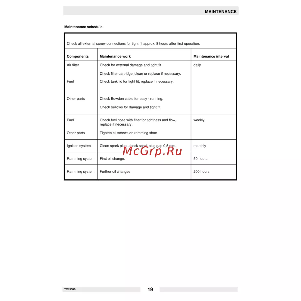 Ignition system Clean spark plug, check spark plug gap 0,5 mm. monthly