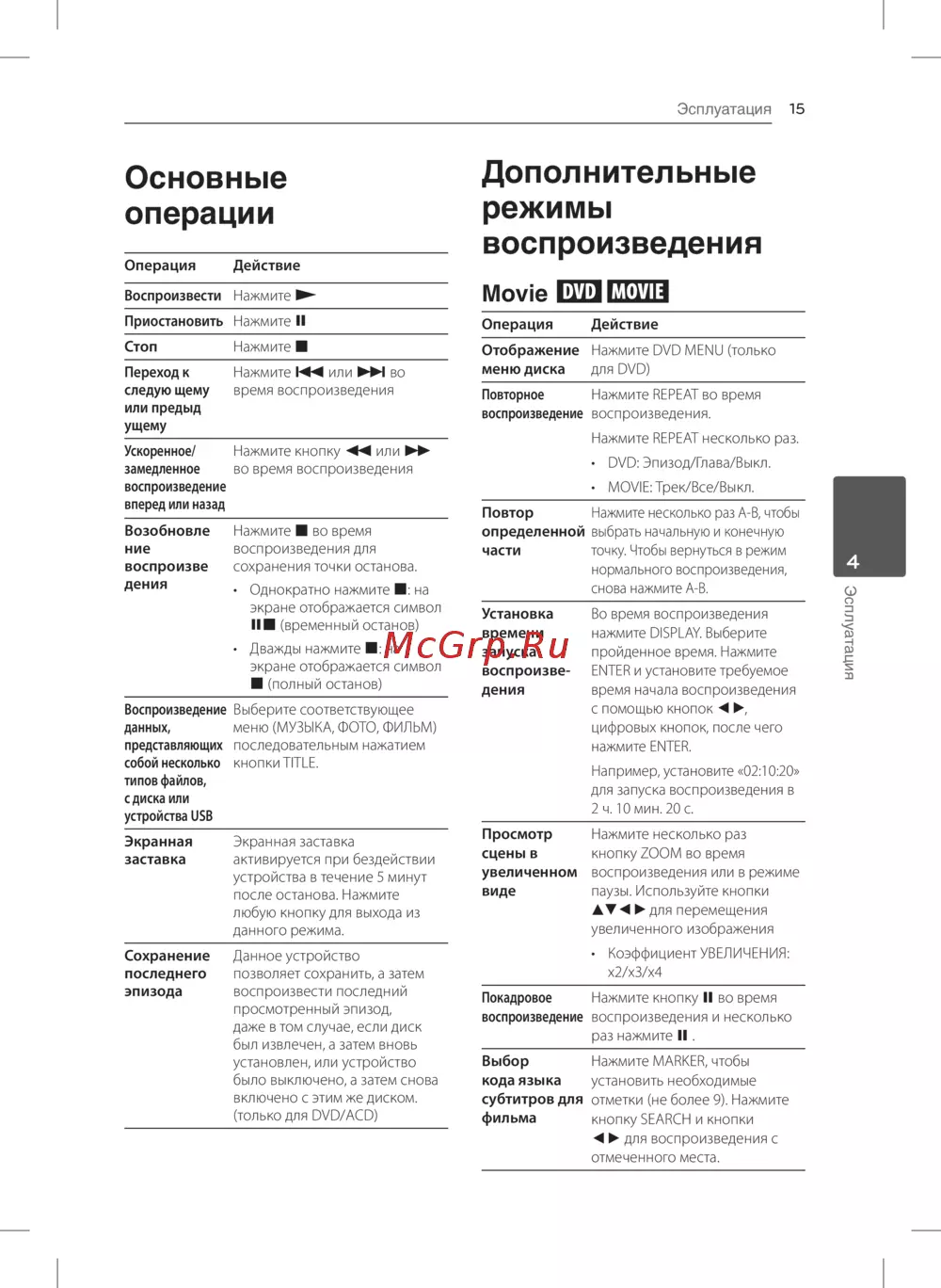 Эсплуатация 15 Основные операции Дополнительные режимы воспроизведения Операция Действие Воспроизвести Нажмите Приостановить Нажмите II Операция Стоп Нажмите Отображение Нажмите DVD MENU только Переход к Нажмите 1ЧЧ или во время воспроизведения меню диска для DVD Повторное Нажмите REPEAT во время следую щему или предыд ущему Movie ШИ MOVIE Действие воспроизведение воспроизведения Нажмите REPEAT несколько раз Ускоренное Нажмите кнопку ЧЧ или замедленное во время воспроизведения DVD Эпизод Глава Выкл воспроизведение MOVIE Трек Все Выкл вперед или назад Повтор Возобновле ние Нажмите во время воспроизведения для воспроизве сохранения точки останова определенной выбрать начальную и конечную части нормального воспроизведения снова нажмите А В Однократно нажмите на экране отображается символ временный останов Дважды нажмите на экране отображается символ полный останов точку Чтобы вернуться в режим Установка Вовремя воспроизведения времени нажмите DISPLAY Выберите запуска пройденное время Нажмите воспроизве ENTER и установите требуемое дения время начала воспроизведения воспроизведение Выберите соответствующее данных меню МУЗЫКА ФОТО ФИЛЬМ с помощью кнопок 4 представляющих последовательным нажатием нажмите ENTER цифровых кнопок после чего собой несколько кнопки TITLE Например установите 02 10 20 типов файлов сдиска или для запуска воспроизведения в 2 ч 10 мин 20 с устройства USB Экранная Экранная заставка заставка активируется при бездействии устройства в течение 5 минут после останова Нажмите Сохранение последнего эпизода Просмотр Нажмите несколько раз сцены в кнопку ZOOM во время увеличенном воспроизведения или в режиме виде паузы Используйте кнопки любую кнопку для выхода из АТ 4 для перемещения данного режима увеличенного изображения Данное устройство позволяет сохранить а затем воспроизвести последний Коэффициент УВЕЛИЧЕНИЯ просмотренный эпизод даже в том случае если диск х2 хЗА4 Покадровое Нажмите кнопку II во время воспроизведение воспроизведения и несколько раз нажмите II был извлечен а затем вновь установлен или устройство Выбор Нажмите MARKER чтобы было выключено а затем снова кода языка установить необходимые включено с этим же диском только для DVD ACD субтитров для отметки не более 9 Нажмите фильма кнопку SEARCH и кнопки 4 для воспроизведения с отмеченного места Эсплуатация дения Нажмите несколько раз А В чтобы