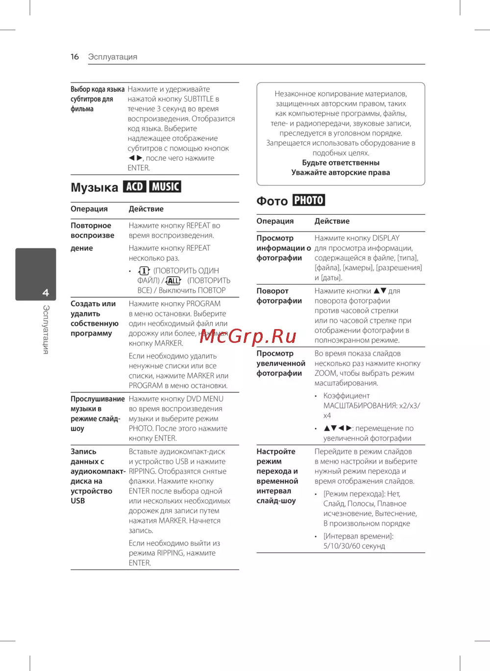16 Эсплуатация Выбор кода языка Нажмите и удерживайте субтитров для Незаконное копирование материалов нажатой кноп ку SU BTITLE в защищенных авторским правом таких фильма течение 3 секунд во время как компьютерные программы файлы воспроизведения Отобразится теле и радиопередачи звуковые записи код языка Выберите преследуется в уголовном порядке надлежащее отображение Запрещается использовать оборудование в субтитров с помощью кнопок подобных целях после чего нажмите Будьте ответственны ENTER Уважайте авторские права Музыка Фото PHOTO Операция Действие Повторное Нажмите кнопку REPEAT во воспроизве время воспроизведения Просмотр Нажмите кнопку DISPLAY дение Нажмите кнопку REPEAT информации о для просмотра информации несколько раз фотографии содержащейся в файле типа Операция файла камеры разрешения ф ПОВТОРИТЬ ОДИН и даты ФАЙЛ ПОВТОРИТЬ ВСЕ Выключить ПОВТОР Эсплуатация Создать или Нажмите кнопку PROGRAM удалить в меню остановки Выберите собственную один необходимый файл или программу дорожку или более нажимая Действие Поворот Нажмите кнопки AV для фотографии поворота фотографии против часовой стрелки или по часовой стрелке при отображении фотографии в полноэкранном режиме кнопку MARKER Если необходимо удалить Просмотр Во время показа слайдов ненужные списки или все увеличенной несколько раз нажмите кнопку списки нажмите MARKER или фотографии ZOOM чтобы выбрать режим масштабирования PROGRAM в меню остановки Прослушивание Нажмите кнопку DVD MENU музыки в во время воспроизведения режиме слайд музыки и выберите режим шоу PHOTO После этого нажмите Коэффициент МАСШТАБИРОВАНИЯ х2 хЗ х4 АТ перемещение по кнопку ENTER увеличенной фотографии Запись Вставьте аудиокомпакт диск Настройте Перейдите в режим слайдов данных с и устройство USB и нажмите режим в меню настройки и выберите аудиокомпакт RIPPING Отобразятся снятые перехода и нужный режим перехода и диска на флажки Нажмите кнопку временной время отображения слайдов устройство ENTER после выбора одной интервал USB или нескольких необходимых слайд шоу дорожек для записи путем нажатия MARKER Начнется Режим перехода Нет Слайд Полосы Плавное исчезновение Вытеснение В произвольном порядке запись Интервал времени Если необходимо выйти из режима RIPPING нажмите ENTER 5 10 30 60 секунд