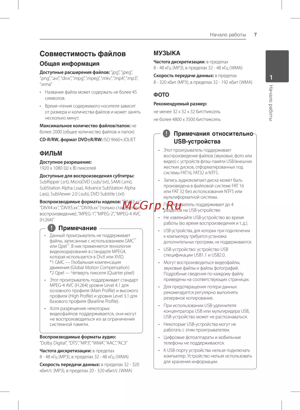 Начало работы 7 Совместимость файлов МУЗЫКА Общая информация Частота дискретизации в пределах 8 48 кГц MP3 в пределах 32 48 кГц WMA Доступные расширения файлов jpg jpeg pngj avi divx mpg mpeg mkv mp4 mp3 Скорость передачи данных в пределах wma 8 320 кбит MP3 в пределах 32 192 кбит WMA Название файла может содержать не более 45 ФОТО символов Время чтения содержимого носителя зависит Рекомендуемый размер от размера и количества файлов и может занять не менее 32 х 32 х 32 бит пиксель несколько минут не более 4800 х 3500 бит пиксель Максимальное количество файлов папок не более 2000 общее количество файлов и папок CD R RW формат DVD R RW ISO 9660 JOLIET ФИЛЬМ Доступное разрешение 1920X 1080 Ш X В пикселей Доступные для воспроизведения субтитры SubRipper sit MicroDVD sub txt SAMI smi SubStation Alpha ssa Advance SubStation Alpha ass SubViewer 2 0 sub DVD Subtitle txt Воспроизводимые форматы кодеков DIVX3 xx DIVX4 xx DIVX5 xx DIVXó xx только стандартное О Примечания относительно USB устройства Этот проигрыватель поддерживает воспроизведение файлов звуковые фото или видео с устройств флэш памяти USB внешних жестких дисков отформатированных под системы FAT16 FAT32 и NTFS Запись аудиокомпакт диска может быть произведена в файловой системе FAT 16 или FAT 32 без использования NTFS или мультиформатной системы Проигрыватель поддержи вает до 4 разделов на USB устройстве воспроизведение MPEG 1 MPEG 2 MPEG 4 AVC Н 264 Не извлекайте USB устройство во время работы во время воспроизведения и т д о Примечание Данный проигрыватель не поддерживает файлы записанные с использованием GMC 1 или Qpelг В них применяется технология видеокодирования в стандарте MPEG4 которая используется в DivX или XVID 1 GMC Глобальная компенсация движения Global Motion Compensation 2 Qpel Четверть пикселя Quarter pixel Этот проигрыватель поддерживает стандарт MPEG 4 AVC Н 264 уровня Level 4 1 для основного профиля Main Profile и высокого профиля High Profile и уровня Level 3 1 для базового профиля Baseline Profile Хотя разрешение некоторых видеофайлов поддерживается они могут не воспроизводиться из за ограничения системной памяти USB устройства для которых при подключении к компьютеру требуется установка дополнительных программ не поддерживаются USB устройство устройство USB спецификации USB1 1 и USB2 0 Могут воспроизводиться видеофайлы звуковые файлы и файлы фотографий Подробные сведения по каждому файлу приведены на соответствующих страницах Для предотвращения потери данных рекомендуется регулярно выполнять резервное копирование При использовании USB удлинителя концентратора USB или мультиридера USB USB устройство может не распознаваться Некоторые USB устройства могут не работать с этим проигрывателем Воспроизводимые форматы аудио Dolby Digital DTS MP3 WMA i AAC AC3 Цифровые фотоаппараты и мобильные телефоны не поддерживаются Частота дискретизации в пределах К USB порту устройства нельзя подключать 8 48 кГц MP3 в пределах 32 48 кГц WMA Скорость передачи данных в пределах 32 320 кбит с MP3 в пределах 20 320 кбит с WMA компьютер Устройство нельзя использовать для хранения информации