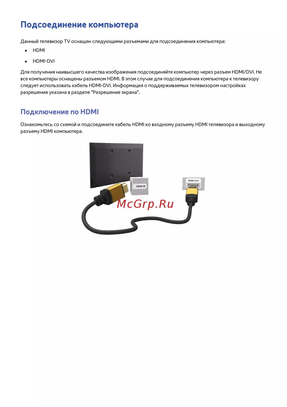 следует использовать кабель HDMI-DVI. Информация о поддерживаемых телевизором настройках