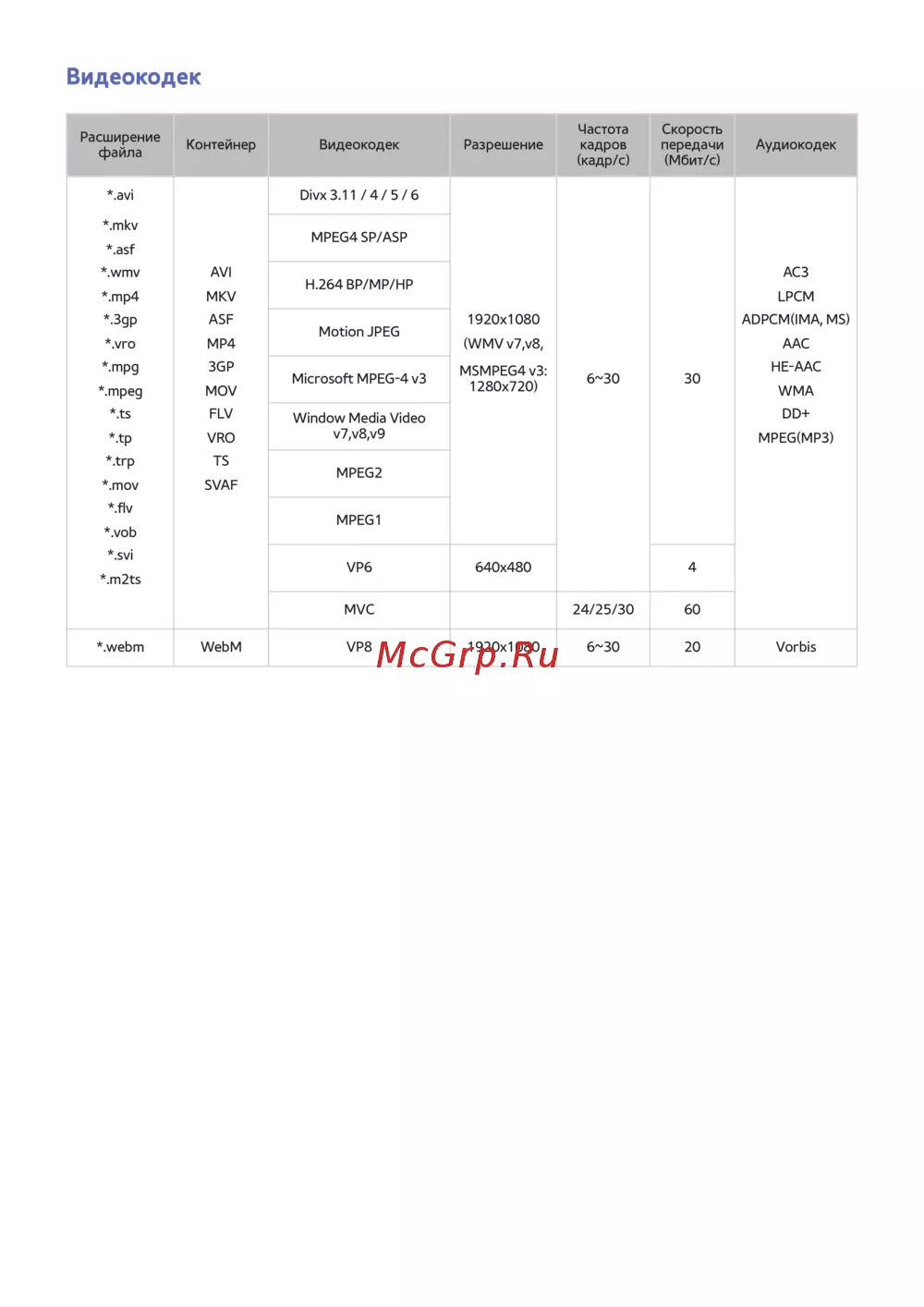 - Формат файлов субтитров и файлов мультимедиа кодек p.172