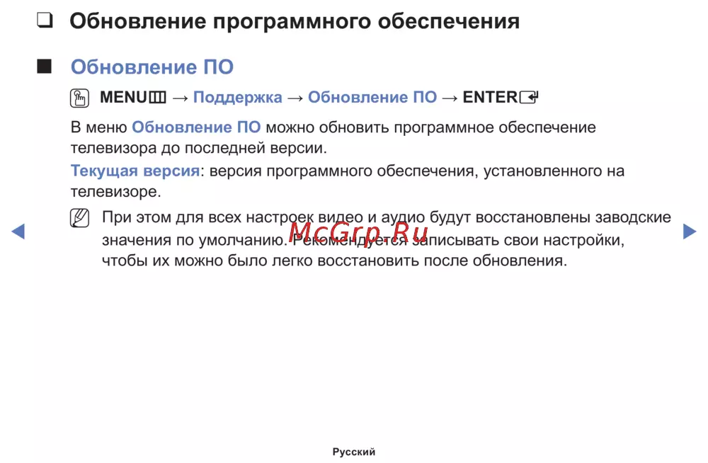 → Поддержка → ОбновлениеПО →ENTER