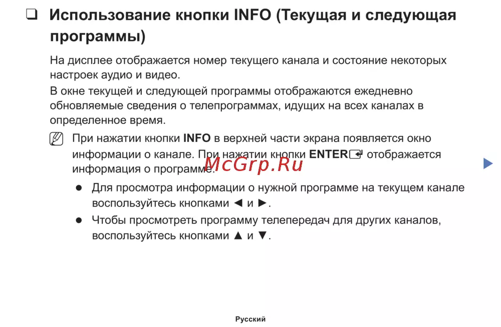 Узнайте, как использовать кнопку INFO для получения информации о текущих и следующих телепрограммах. Легкий доступ к данным о каналах и настройках.