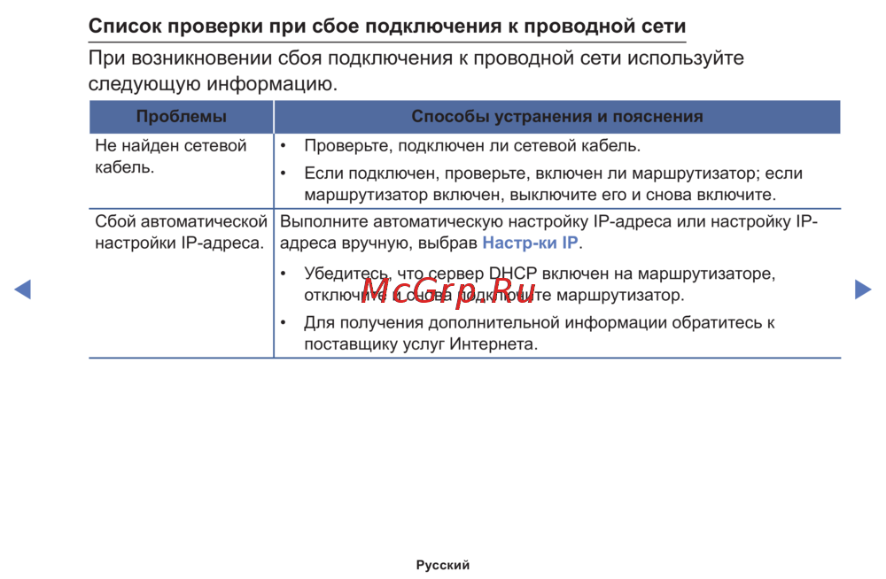 - При возникновении сбоя подключения к проводной сети используйте следующую информацию p.137