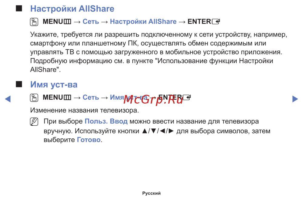 Узнайте, как настроить обмен содержимым и управление телевизором с помощью мобильных устройств. Измените имя устройства и настройте параметры подключения.