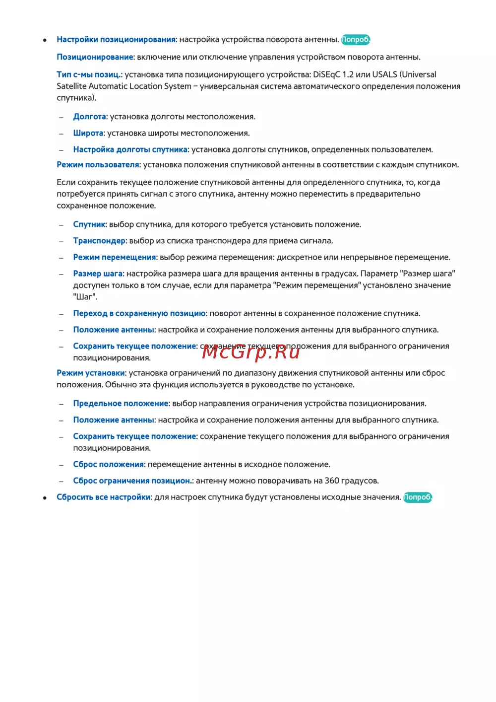 Настройки позиционирования: настройка устройства поворота антенны.