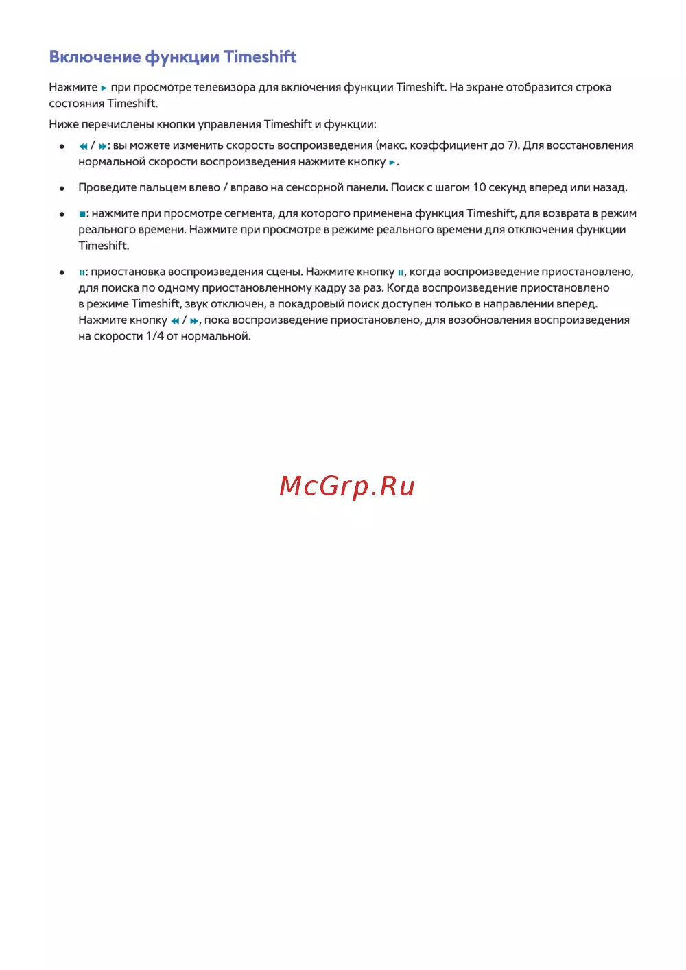 в режиме Timeshift, звук отключен, а покадровый поиск доступен только в направлении вперед.