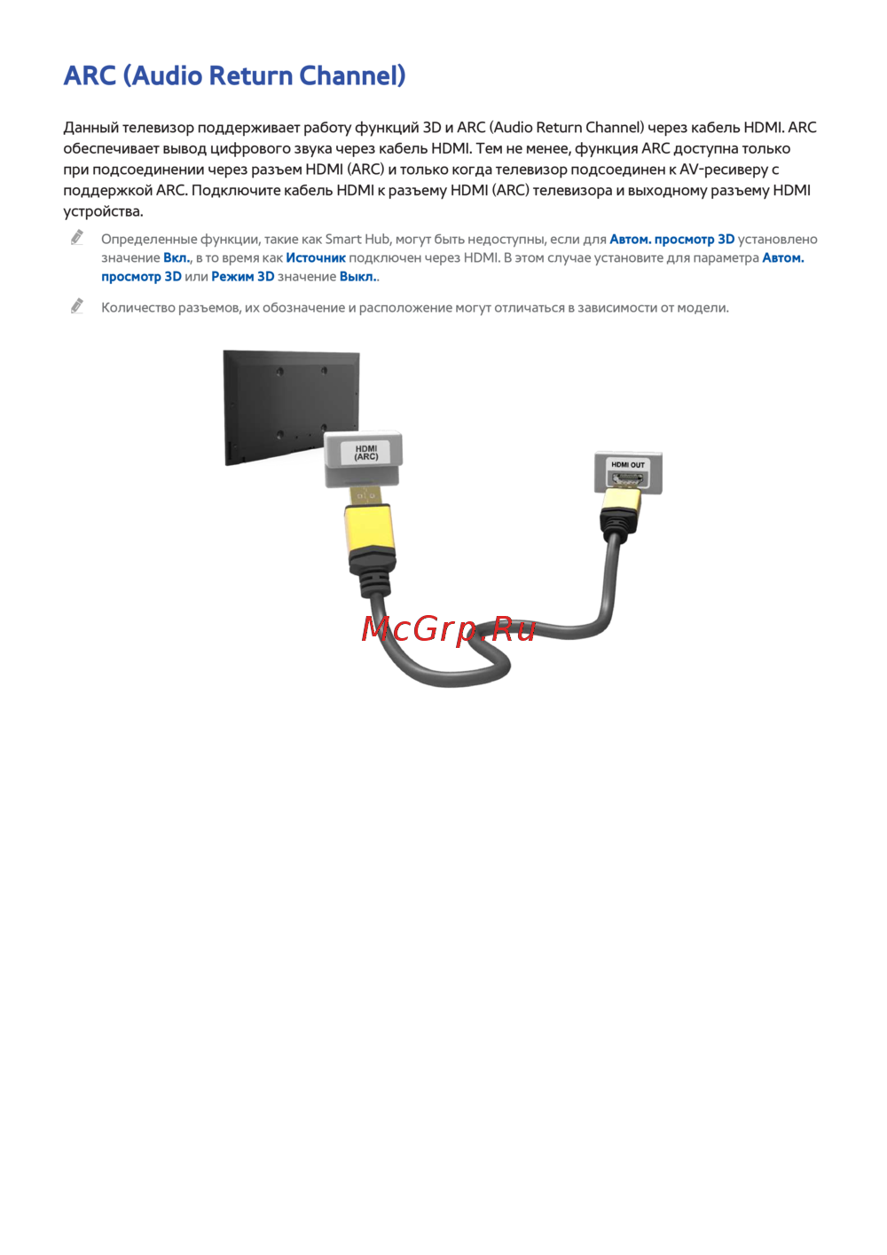 Данный телевизор поддерживает работу функций 3D и ARC (Audio Return Channel) через кабель HDMI. ARC