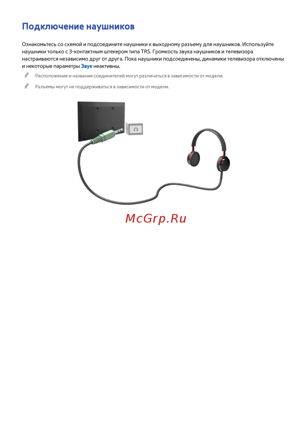 наушники только с 3-контактным штекером типа TRS. Громкость звука наушников и телевизора