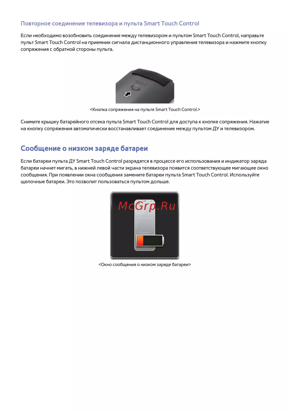 сообщения. При появлении окна сообщения замените батареи пульта Smart Touch Control. Используйте