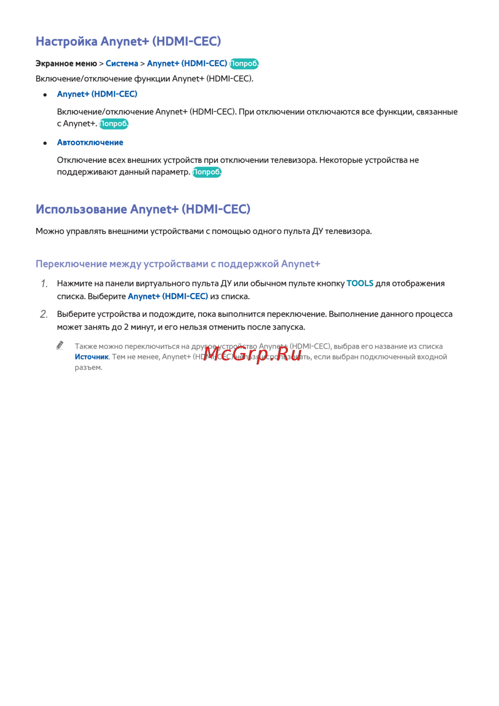 Источник. Тем не менее, Anynet+ (HDMI-CEC) нельзя использовать, если выбран подключенный входной