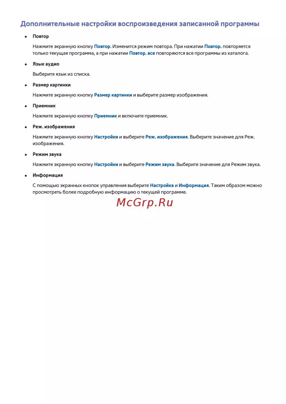 Узнайте, как настроить воспроизведение записанных программ: повтор, выбор языка аудио, изменение размера картинки и режимов изображения и звука.