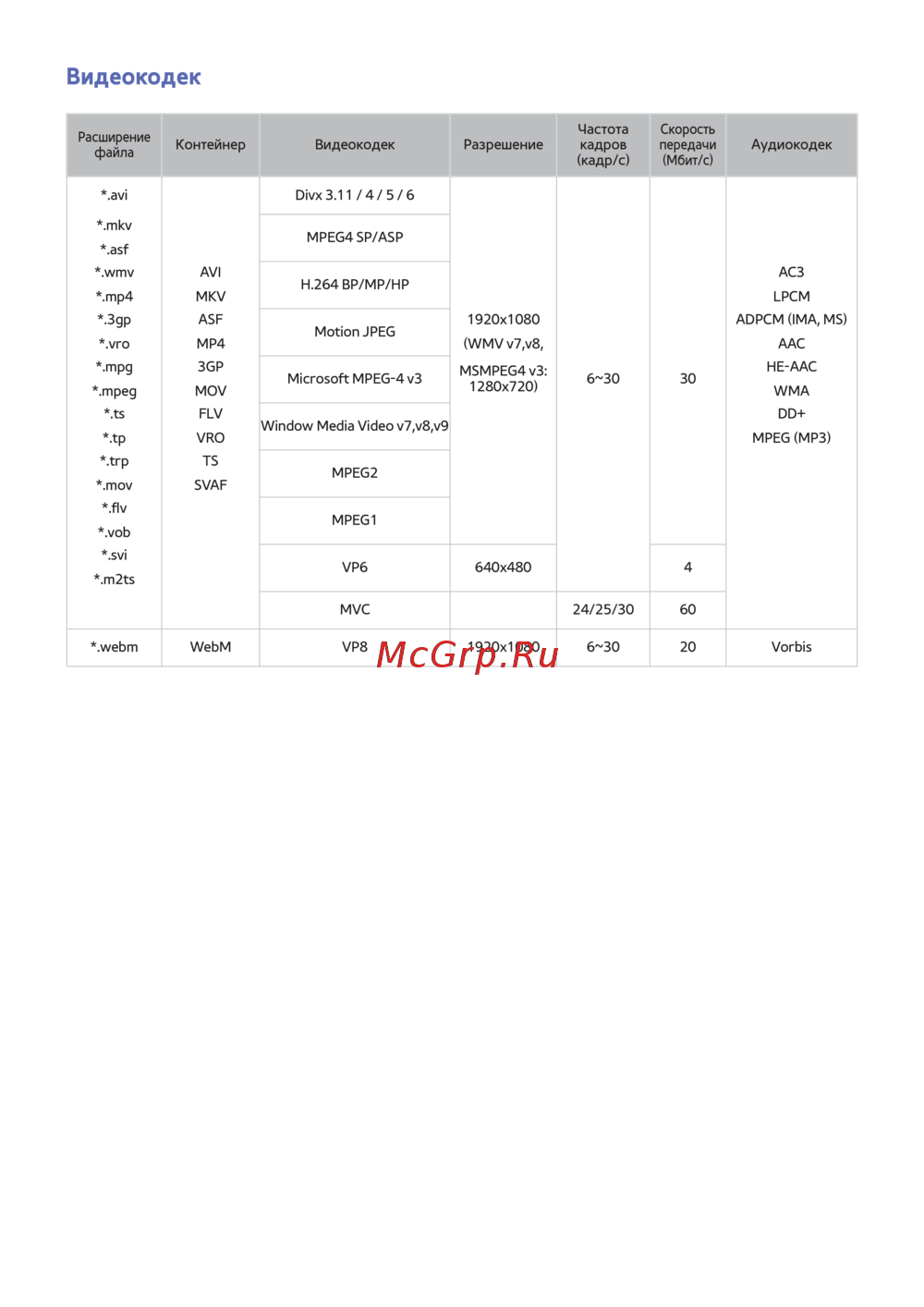 - Формат файлов субтитров и файлов мультимедиа кодек p.179