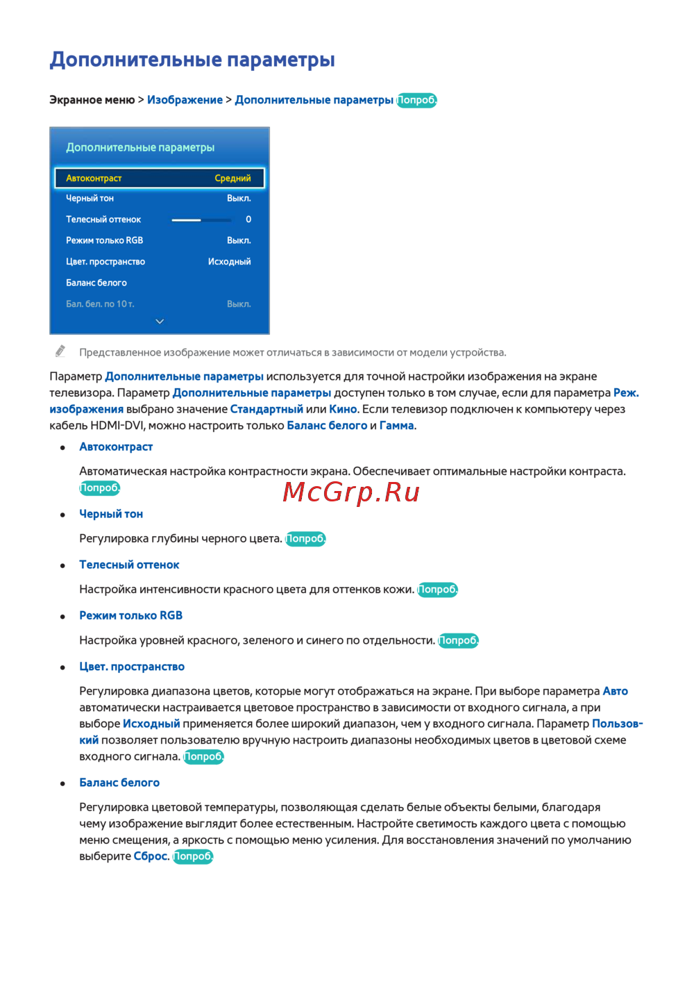 Узнайте, как точно настроить изображение на экране телевизора с помощью дополнительных параметров, таких как автоконтраст, черный тон и баланс белого.