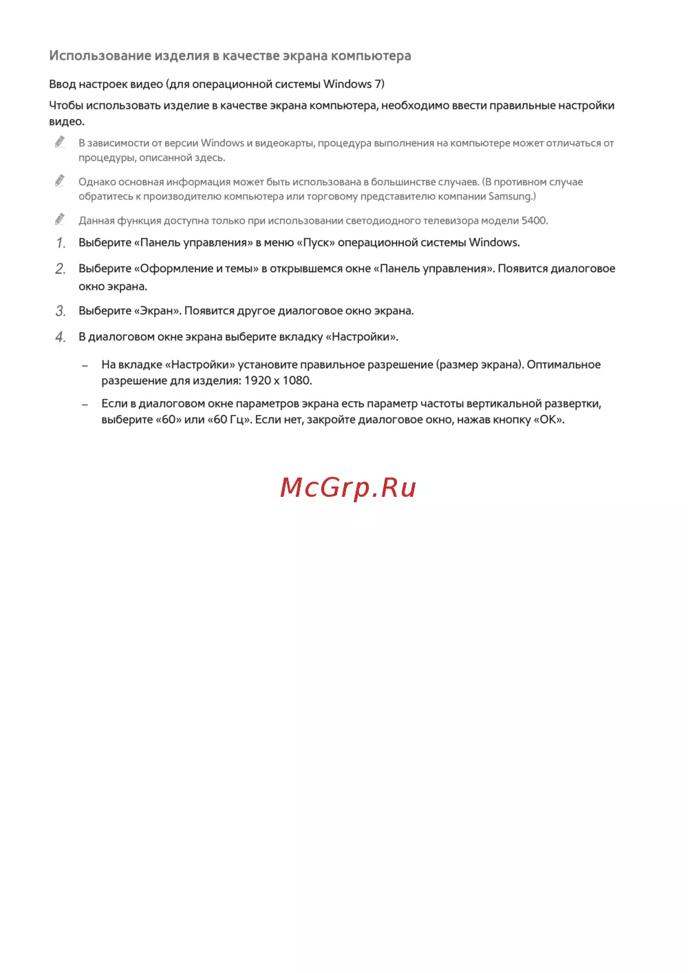 - После подключения компьютера к телевизору установите на компьютере разрешение экрана телевизора оптимальное разрешение 1920 x 1080 60 гц если установить значение не совпадающее со значением указанным в нижеприведенной таблице в телевизоре может ничего не отображаться установите разрешение надлежащим образом согласно указаниям руководства пользователя к компьютеру или видеокарте p.168