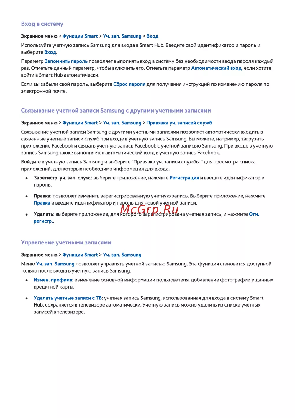Экранное меню > Функции Smart > Уч. зап. Samsung > Вход
