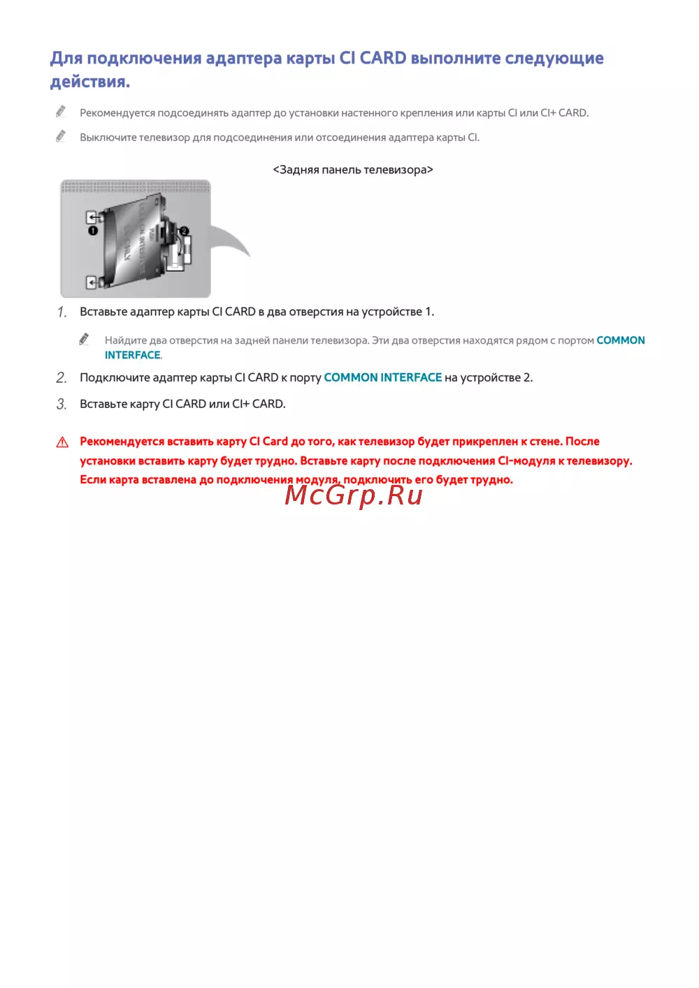 Рекомендуется вставить карту CI Card до того, как телевизор будет прикреплен к стене. После