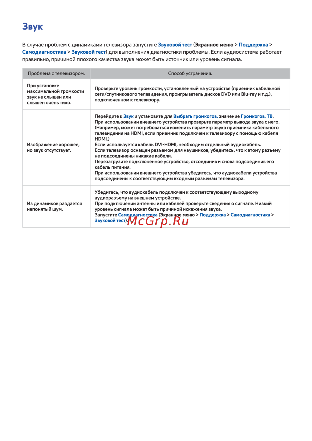 В случае проблем с динамиками телевизора запустите Звуковой тест (Экранное меню > Поддержка >