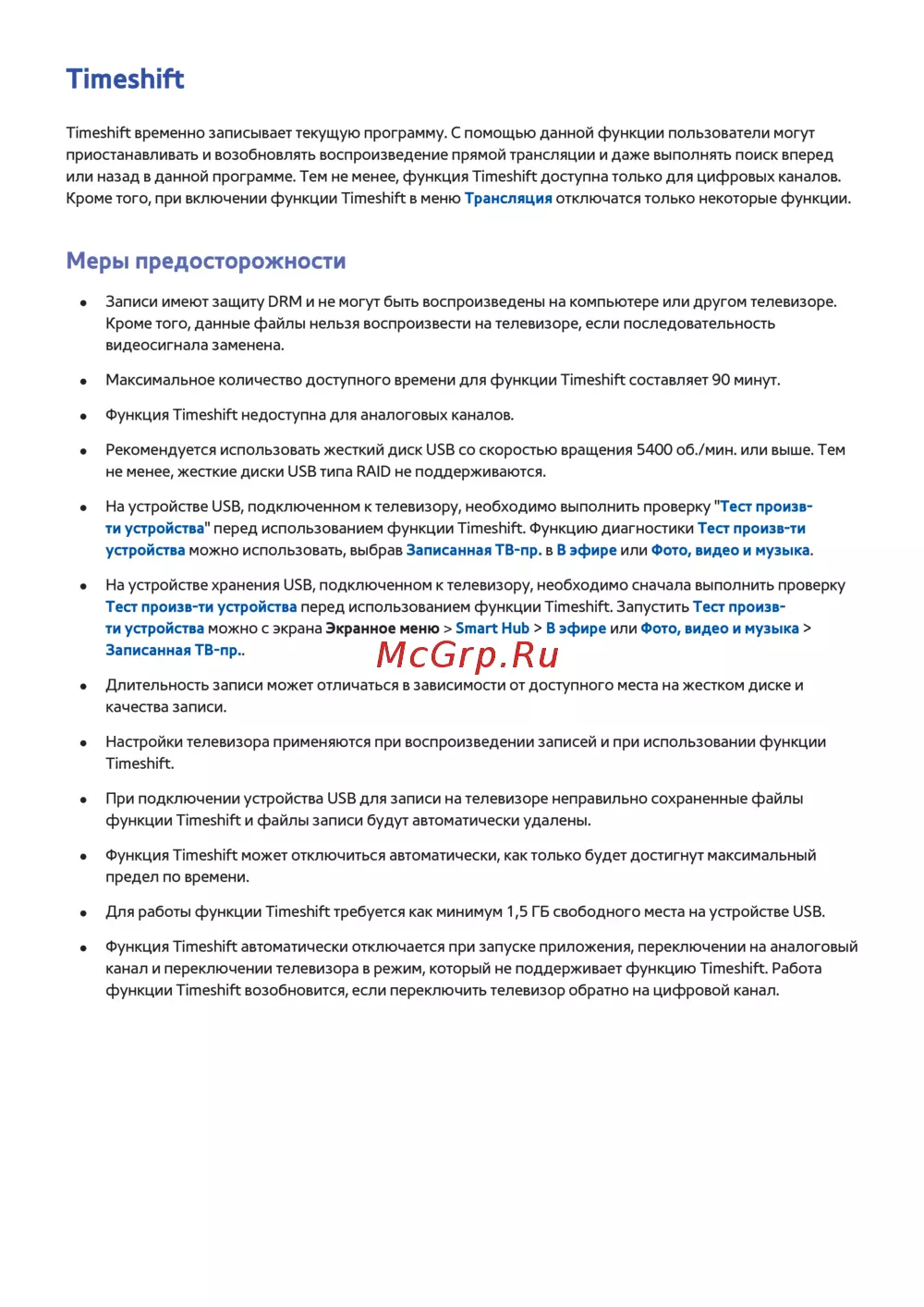 канал и переключении телевизора в режим, который не поддерживает функцию Timeshift. Работа