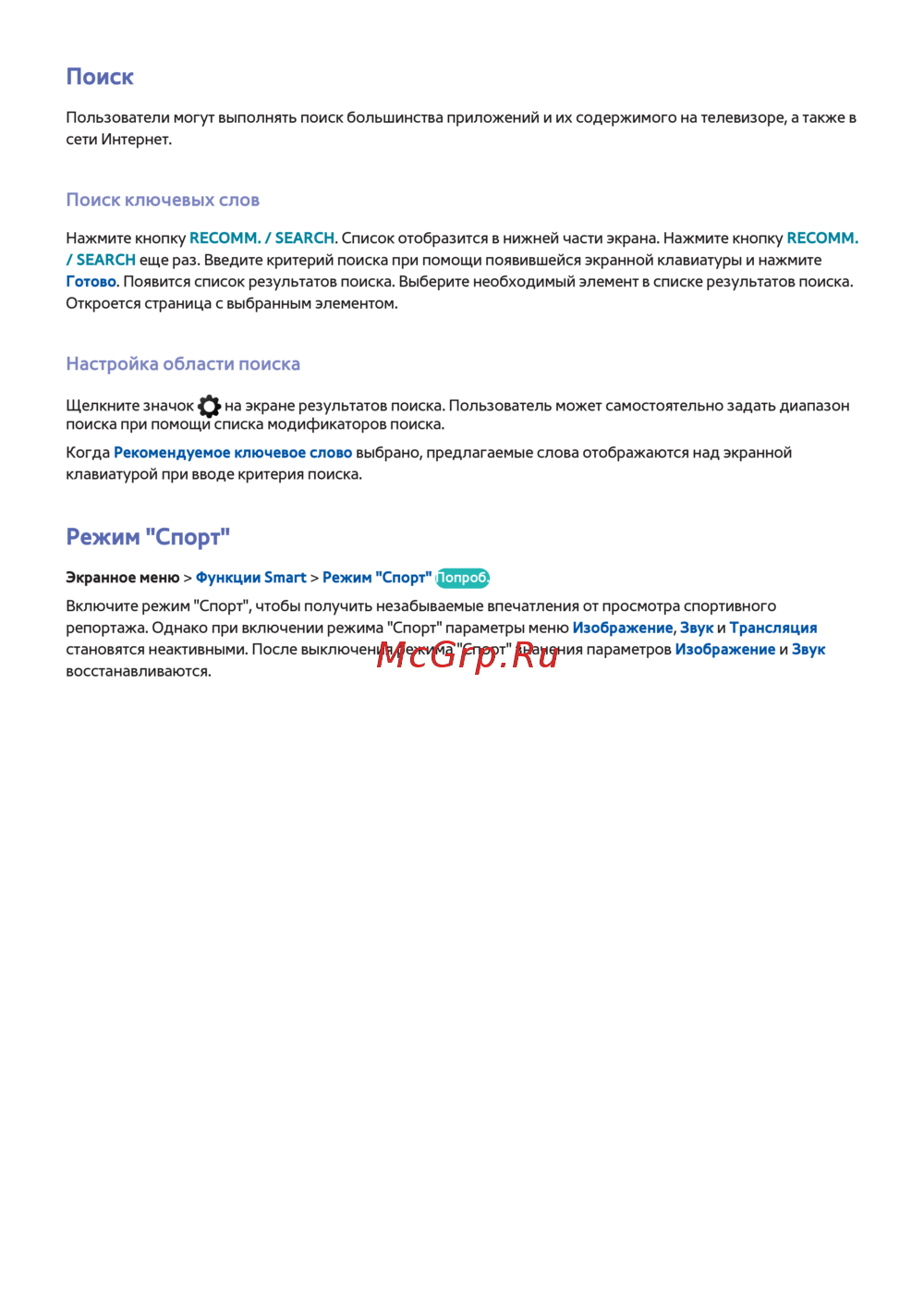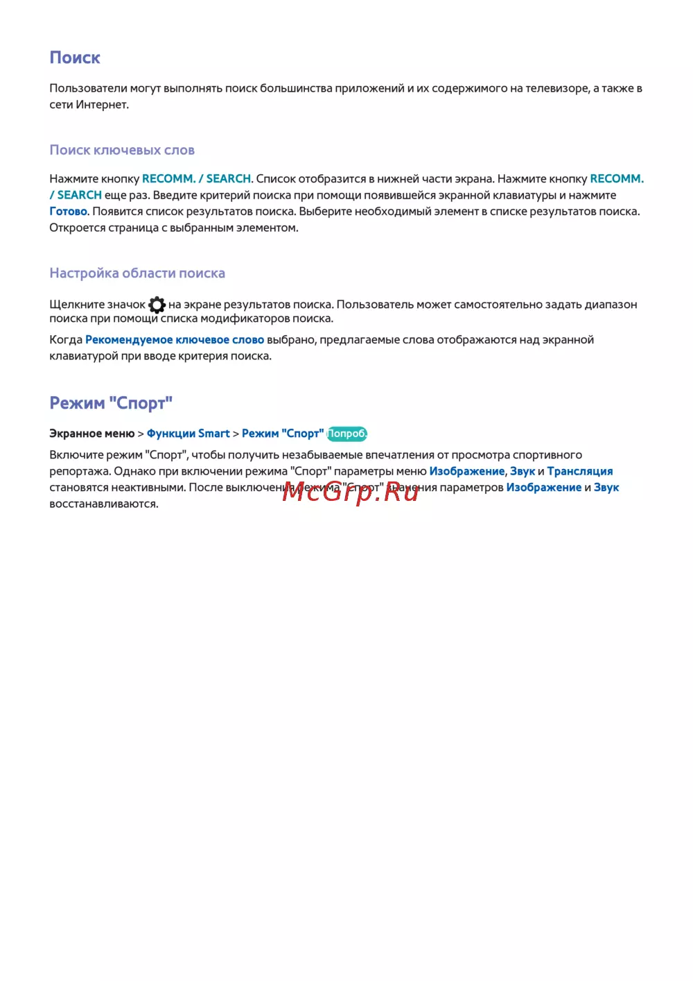 Узнайте, как выполнять поиск приложений и их содержимого на телевизоре, а также настраивать режим 'Спорт' для улучшения впечатлений от просмотра.